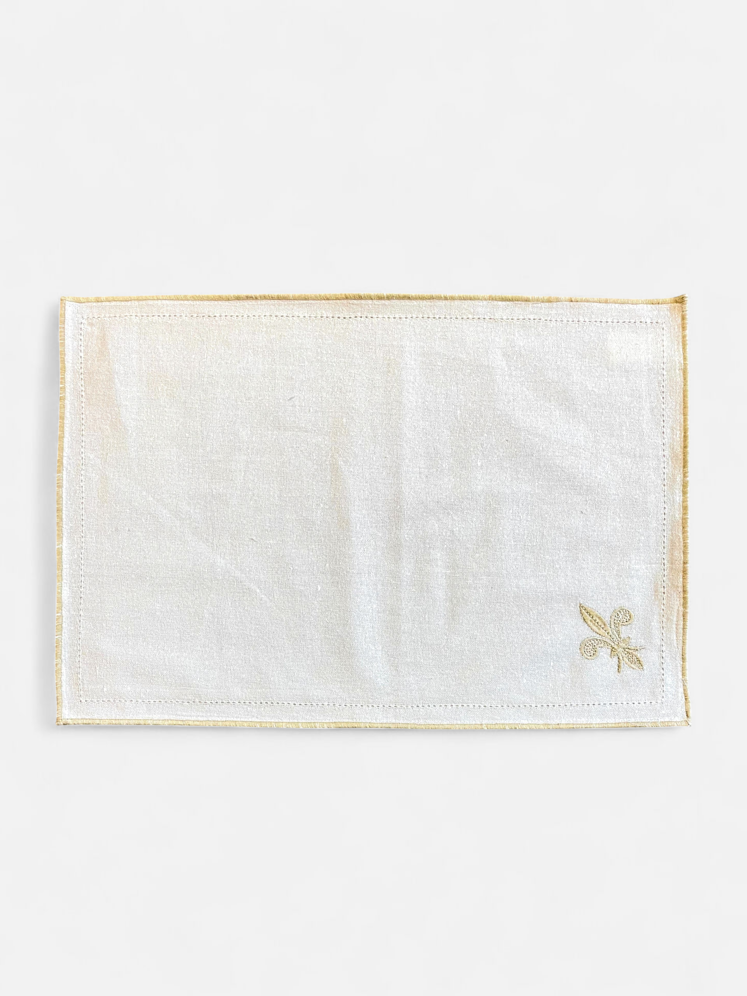 Elevate your tablescape with the timeless charm of our Bellegarde dining mat. Crafted from premium linen and finished with a delicate golden fleur-de-lis, this piece merges classic sophistication with subtle opulence. The finely stitched golden border adds an extra shimmer, perfect for formal dinners or elegant gatherings. A statement of understated luxury, designed to impress every guest.