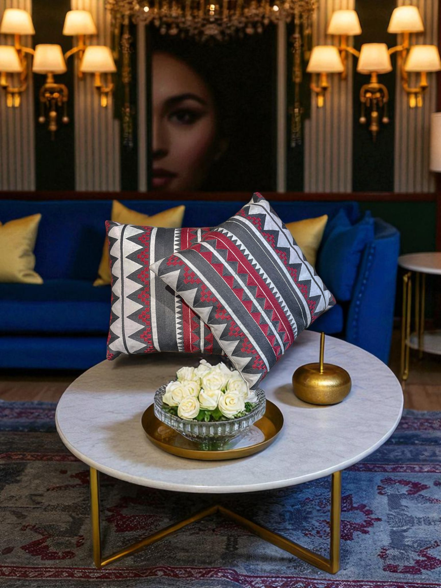 Bold and timeless, the Nirok Edge cushion fuses tribal artistry with modern flair. Featuring striking geometric embroidery in deep crimson, charcoal black, and ivory tones, its dynamic pattern adds depth and texture to any space. Crafted with precision, the cushion radiates a sense of heritage and strength, making it a standout accent for luxe boho, eclectic, or contemporary interiors. Let it bring warmth, edge, and cultural richness to your décor.