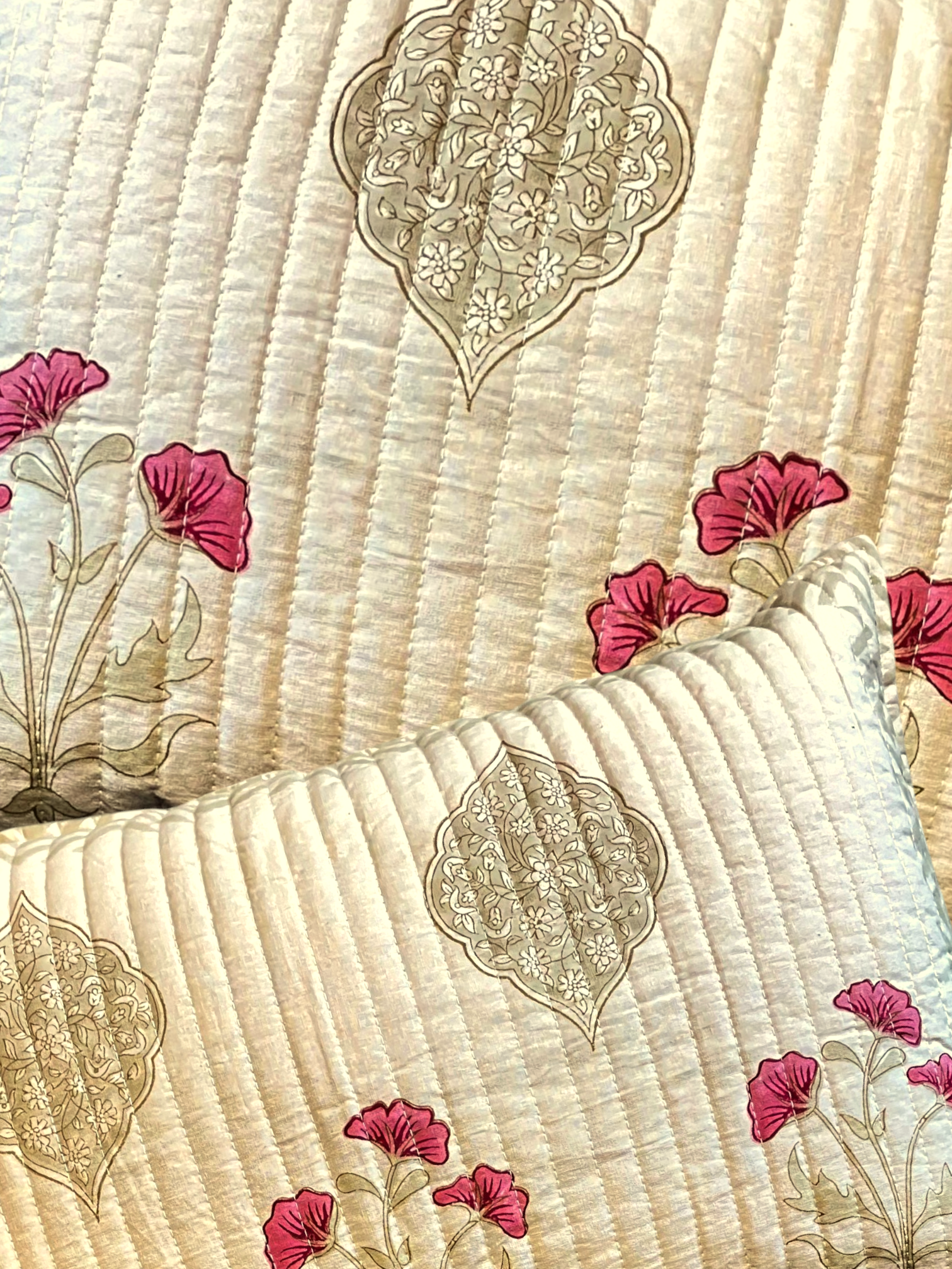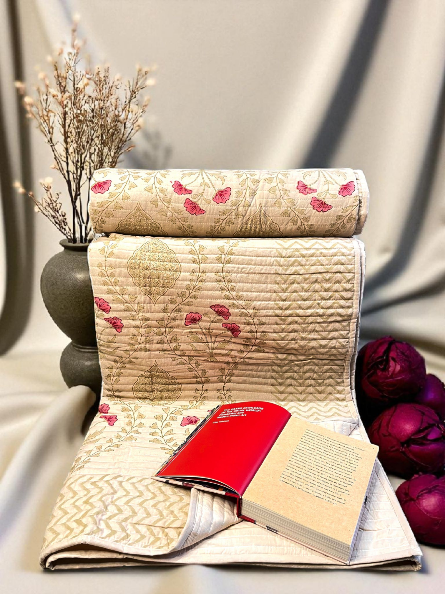 Wrap yourself in timeless elegance with our handcrafted quilted bedspread, featuring intricate golden motifs and blooming pink florals that whisper luxury. The soft beige base brings warmth and serenity, while the delicate stitching speaks to artisanal mastery. Perfect for sophisticated interiors, it’s a blend of heritage design and modern comfort. Elevate your bedding with a touch of royal refinement.