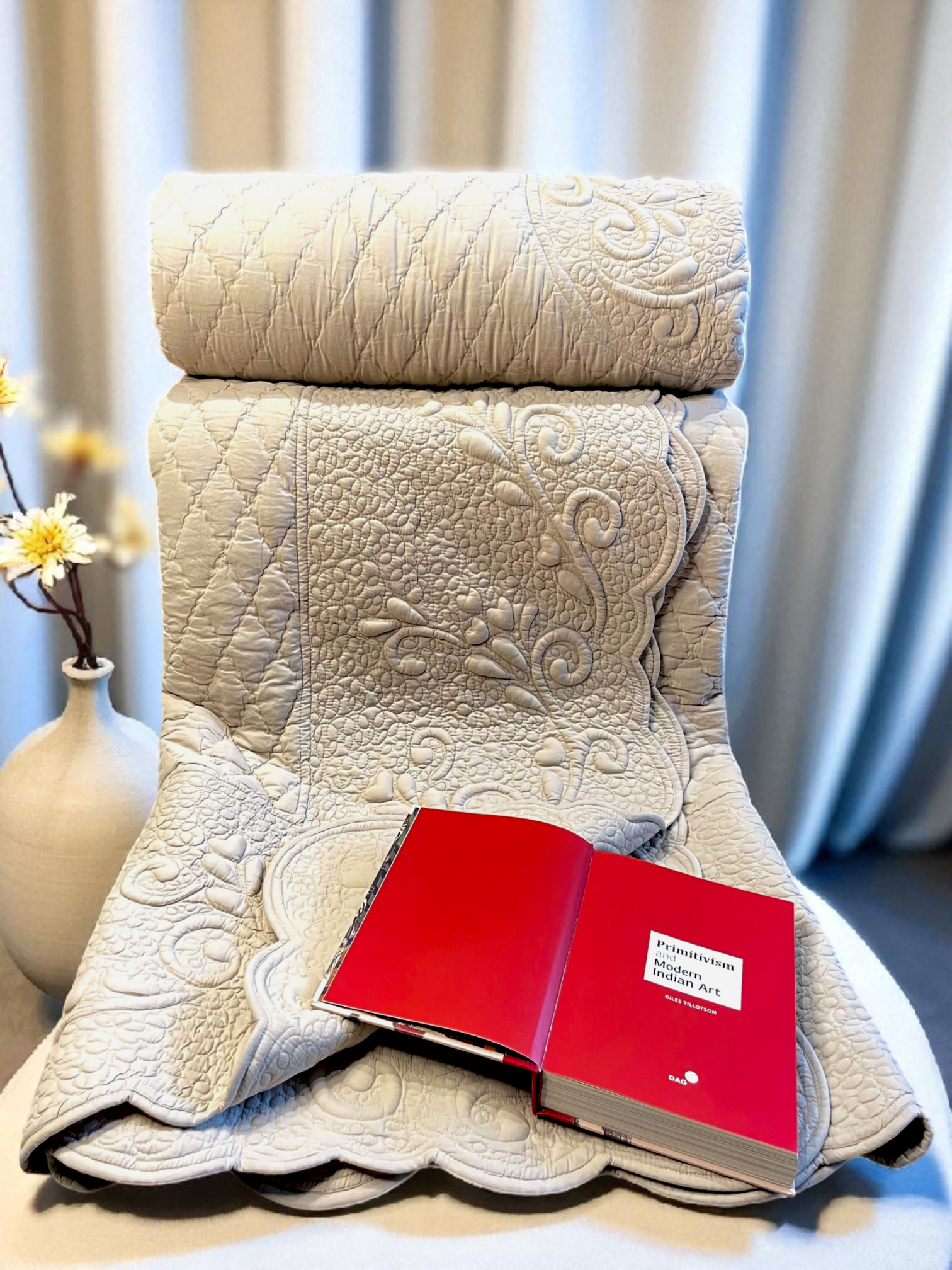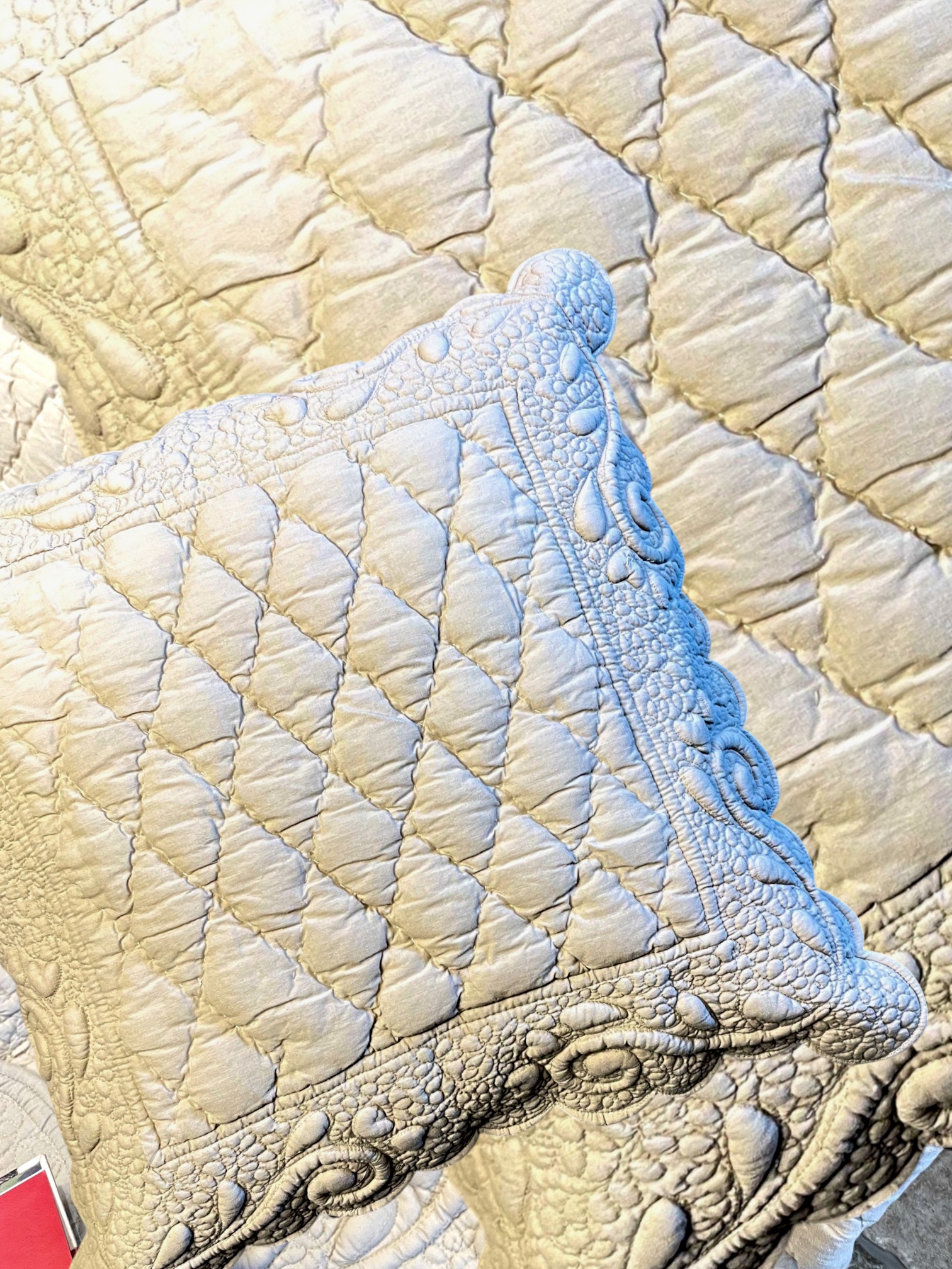 Wrap yourself in timeless elegance with our handcrafted Roselure bedspread. Delicately quilted with ornate floral and diamond patterns, this premium piece is adorned with a scalloped edge and a silky-soft texture that elevates any bedroom. Its calming neutral hue complements both modern and classic decor. Made with expert precision and love, it’s more than a bedspread, it’s a statement of refined luxury.