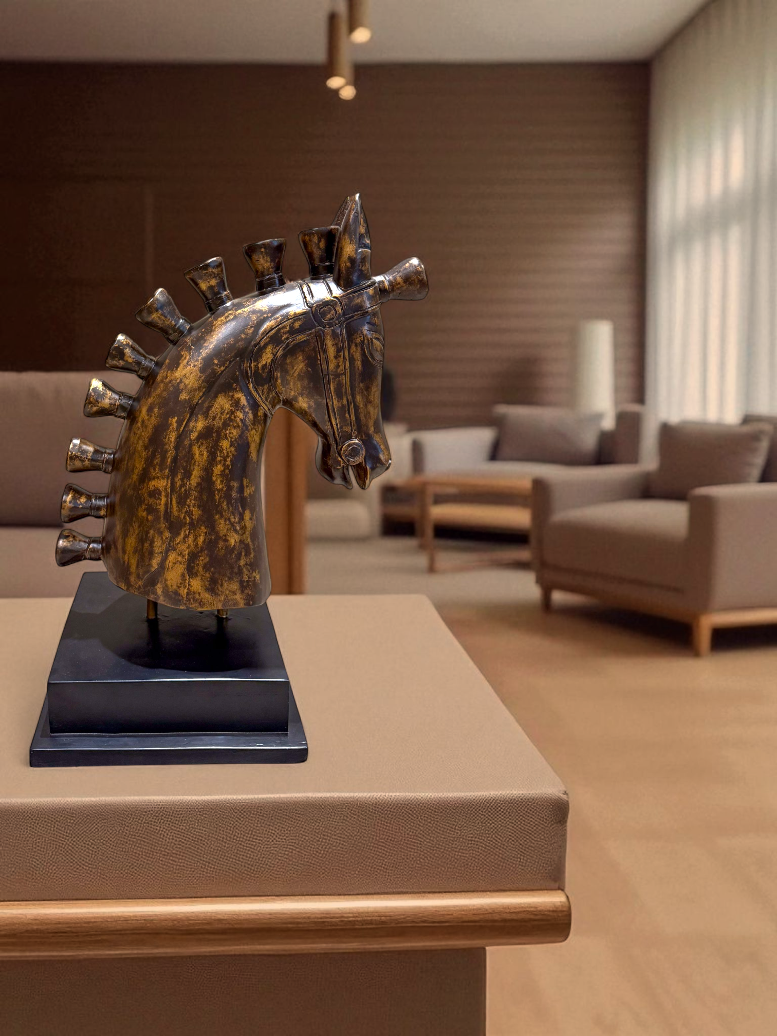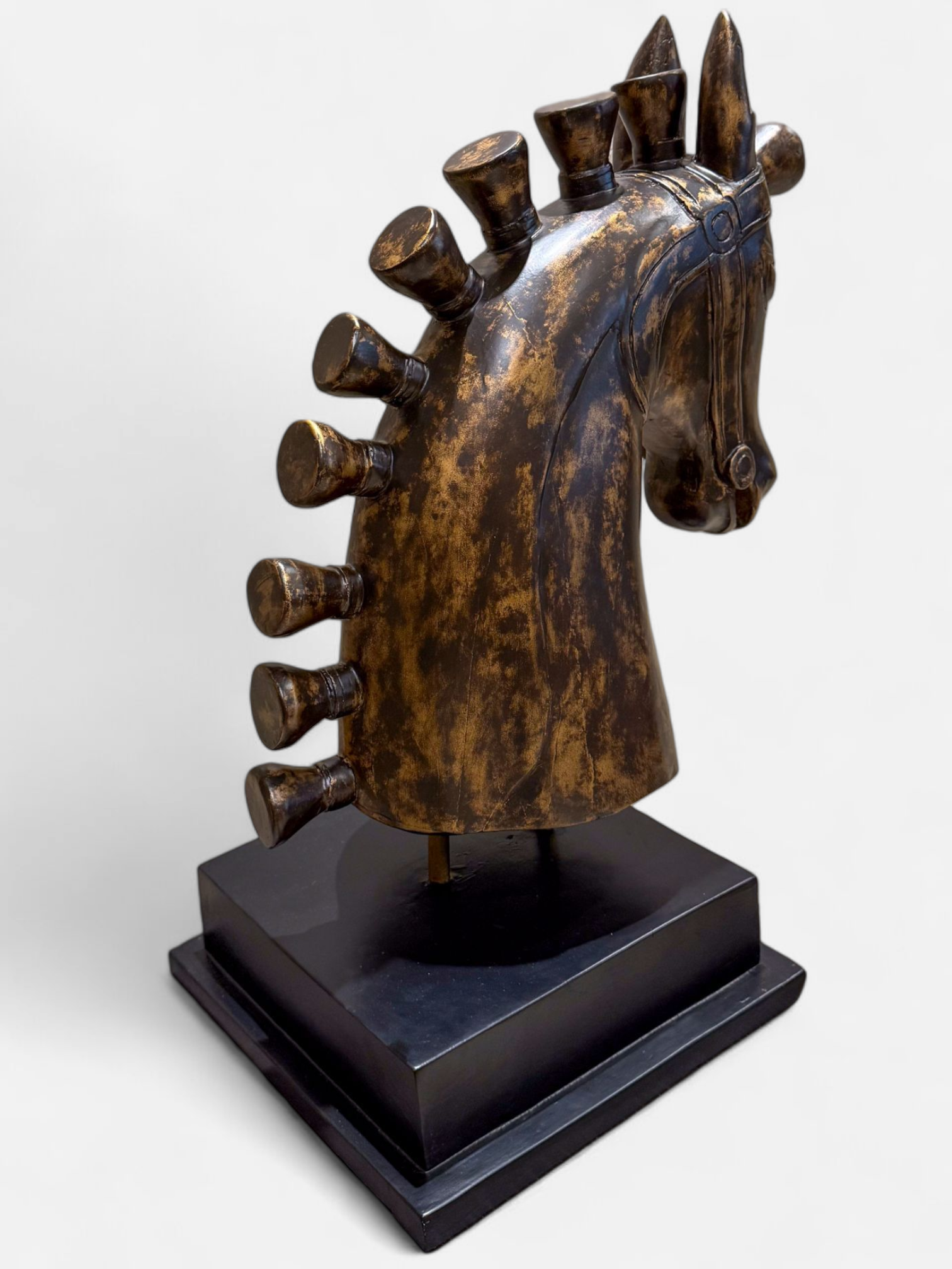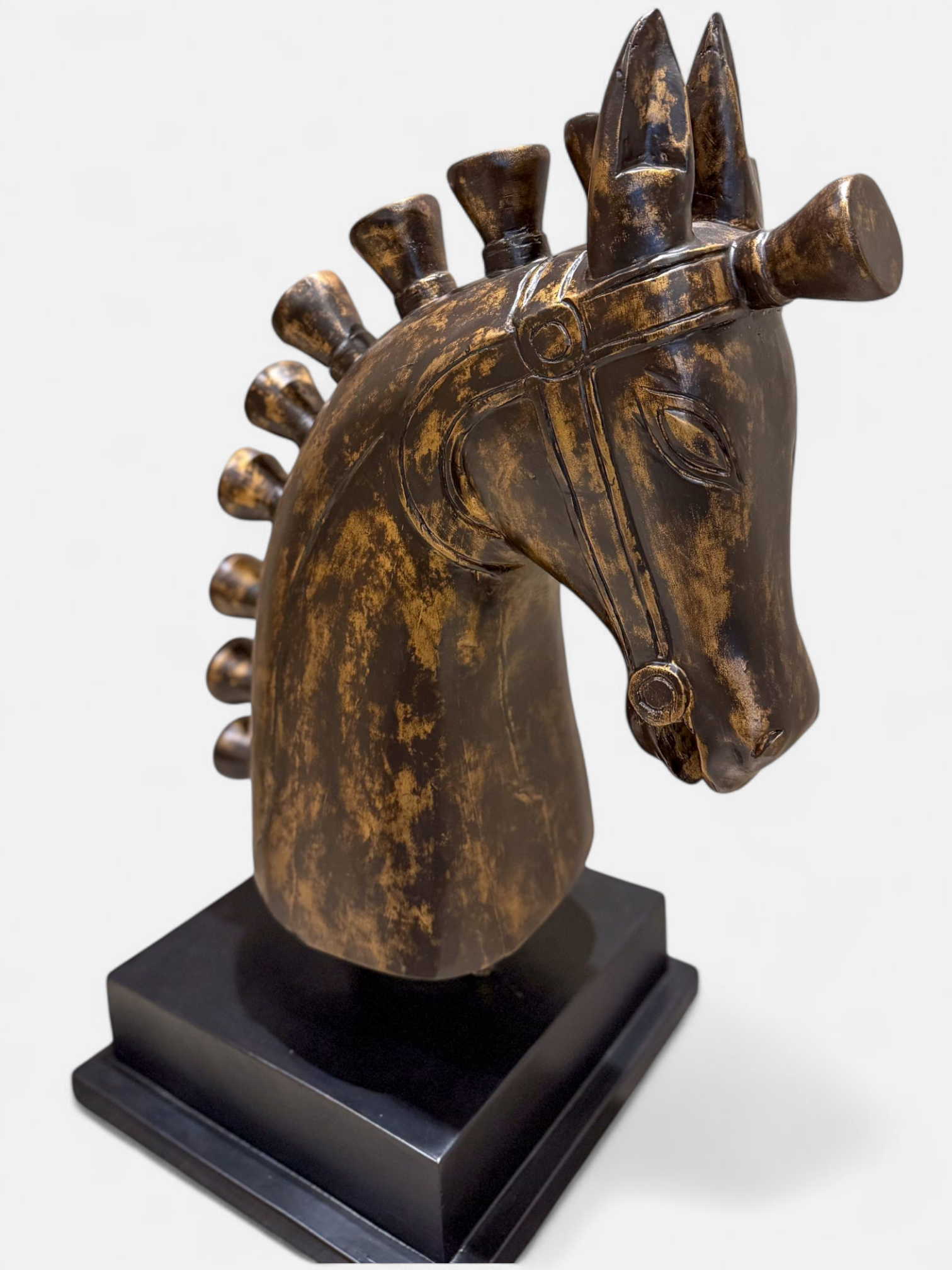 Elevate your space with Black Stallion, a striking sculpture that fuses regal strength with ancient artistry. This horse head bust, adorned with bold, flared mane details and a weathered bronze finish, evokes the power and elegance of classical warhorses. Mounted on a sleek black base, it's a commanding accent for luxury interiors. Ideal for collectors and connoisseurs of timeless decor.