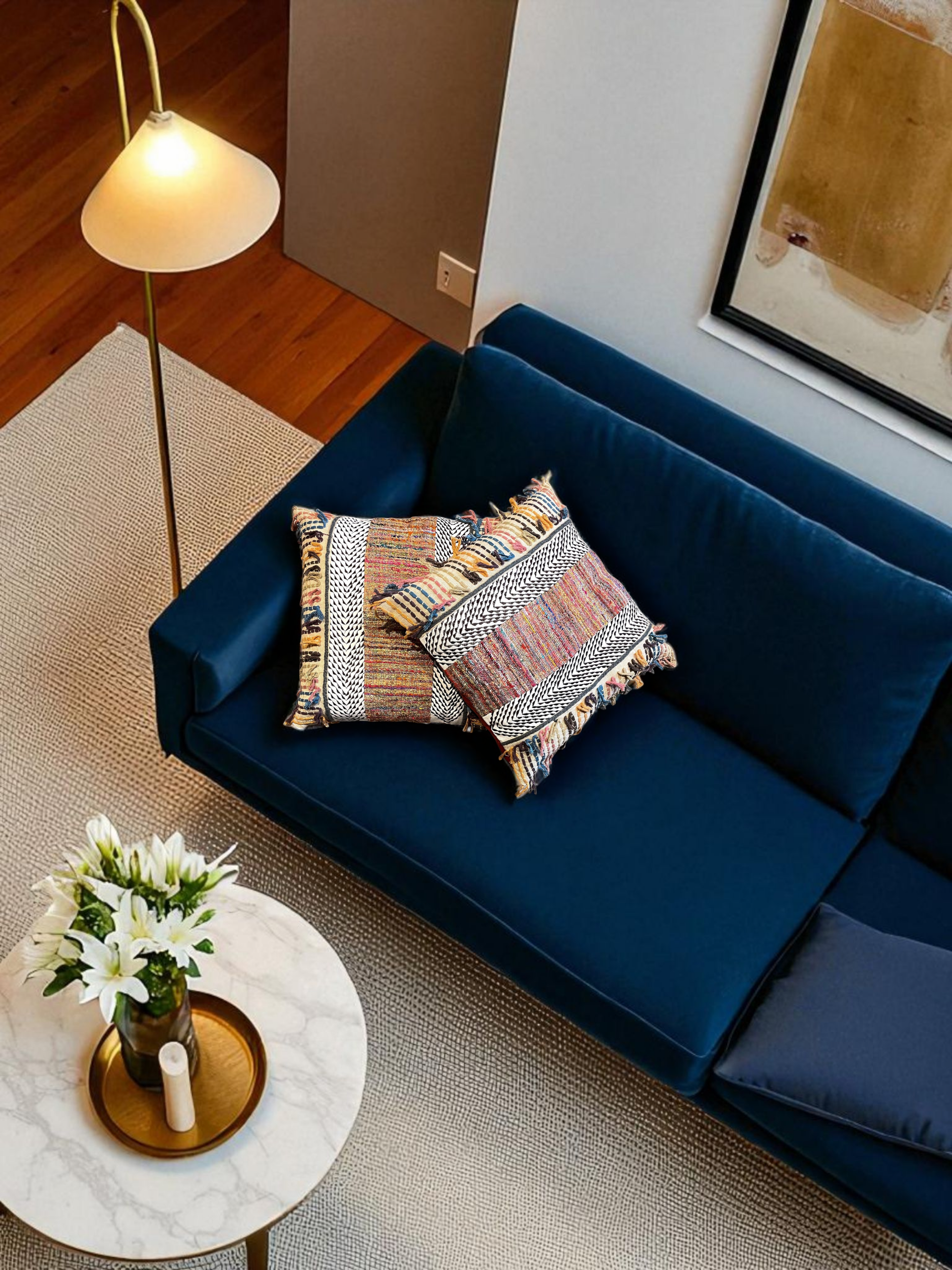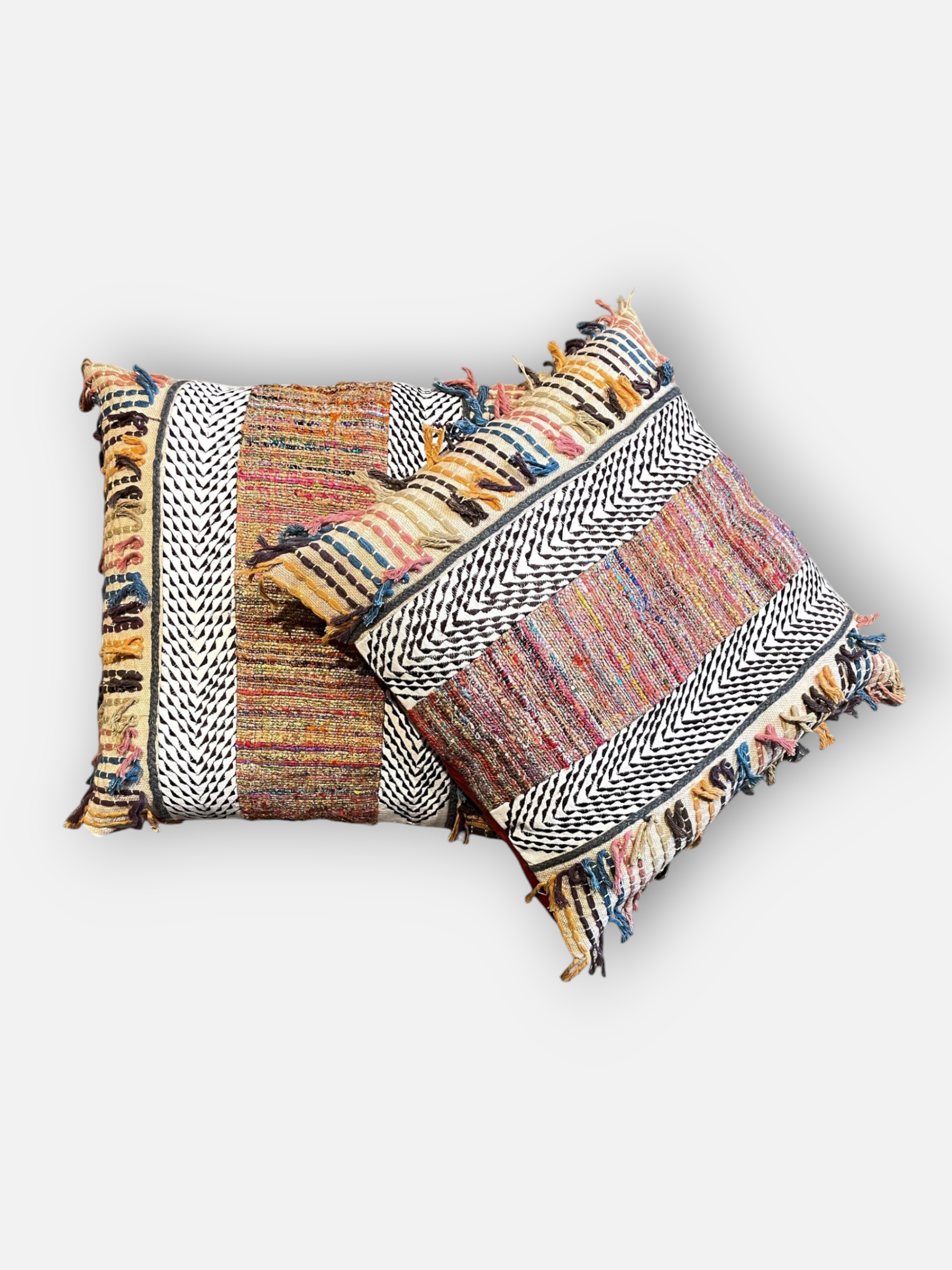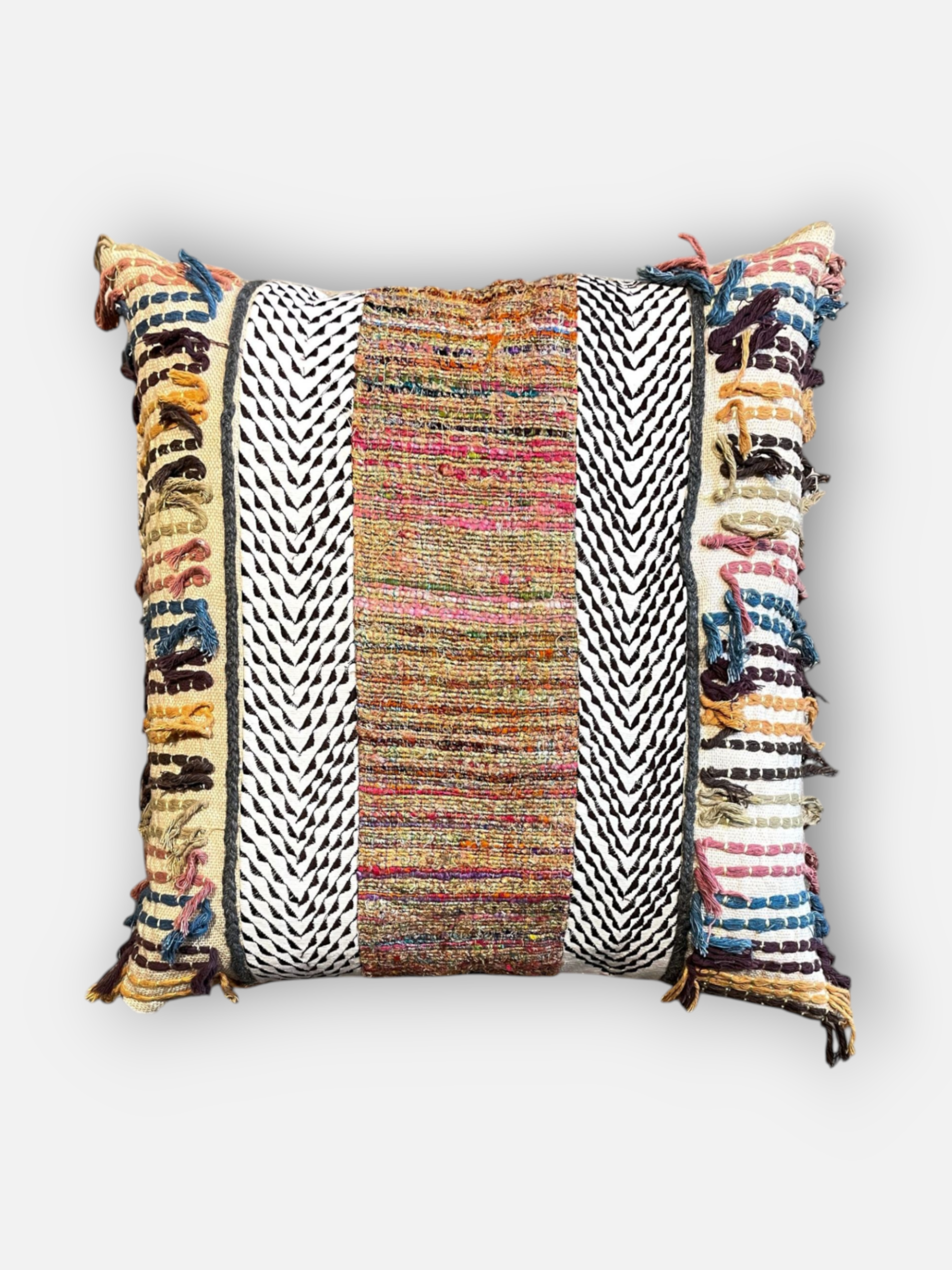 Celebrate culture, color, and craftsmanship with Raga Cushion - a bold fusion cushion that transforms any space into a vibrant sanctuary. Woven with an eclectic blend of multicolored threads, tribal-inspired chevron patterns, and playful fringes, this cushion exudes artistic energy and bohemian luxury. Every detail is a visual journey: from the textured center panel to the intricately embroidered borders. Perfect for adding a splash of character to sofas, reading nooks, or curated corners, this piece invites storytelling, spontaneity, and soul into your décor.