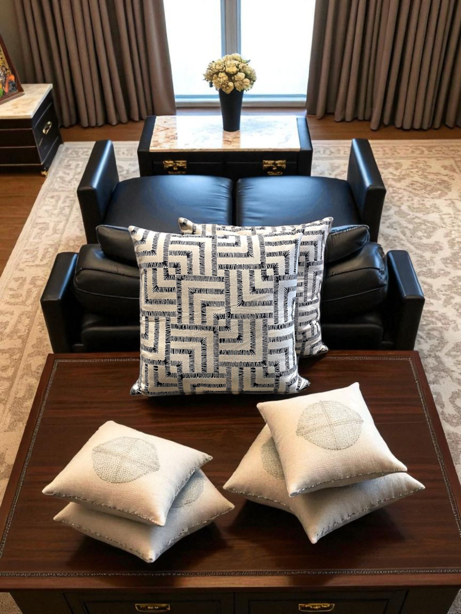 Unravel bold sophistication with Nexa Maze Cushion - a striking cushion that brings modern geometry to life. The black-on-ivory maze-like pattern is meticulously crafted with dynamic, hand-drawn stroke detailing, giving it an artisanal yet architectural edge. Perfect for adding visual intrigue to minimalist spaces, contemporary sofas, or gallery-inspired corners, this cushion transforms structure into style. With its monochrome palette and maze-inspired rhythm, Nexa Maze is both a statement piece and a timeless classic.