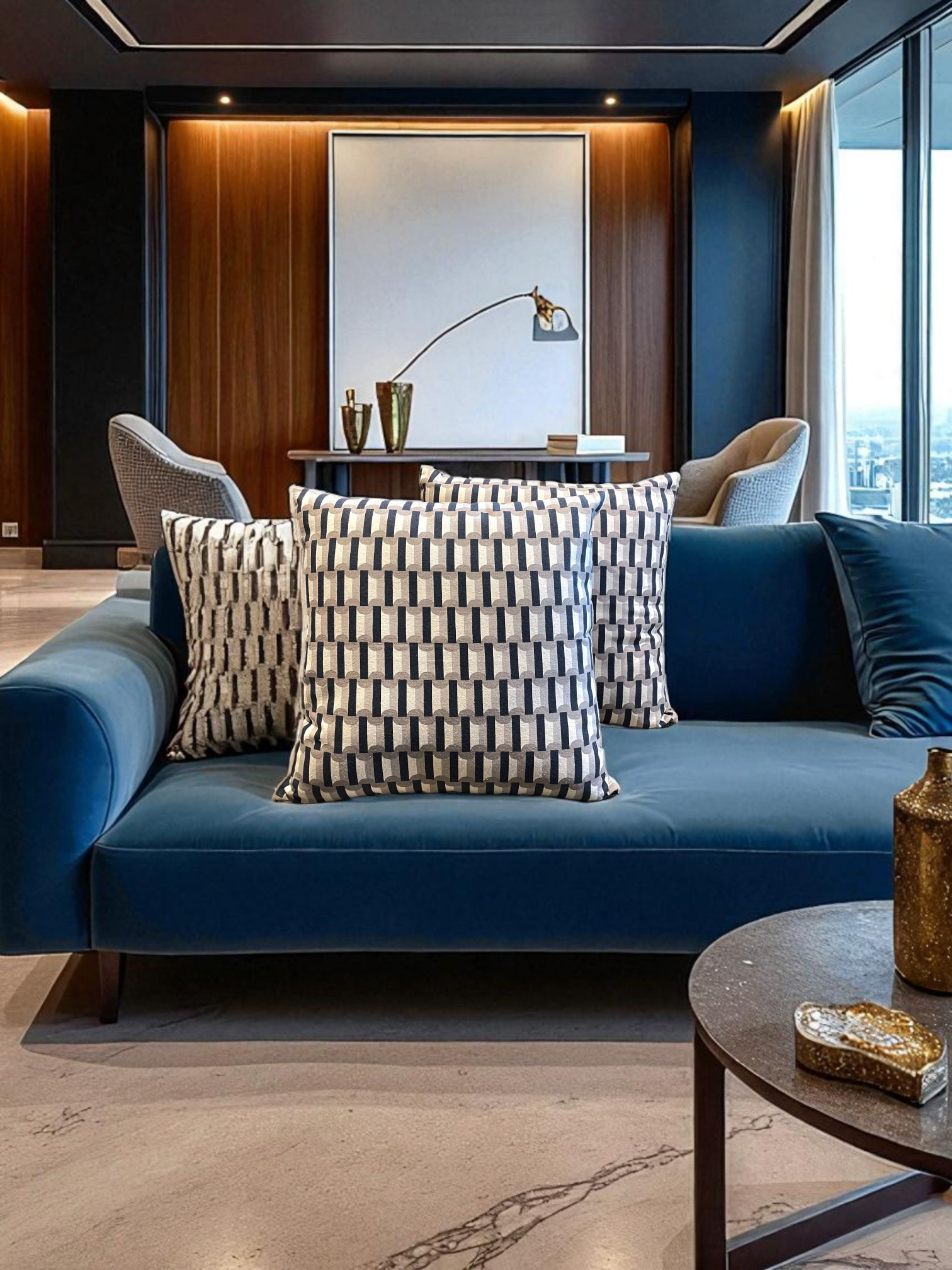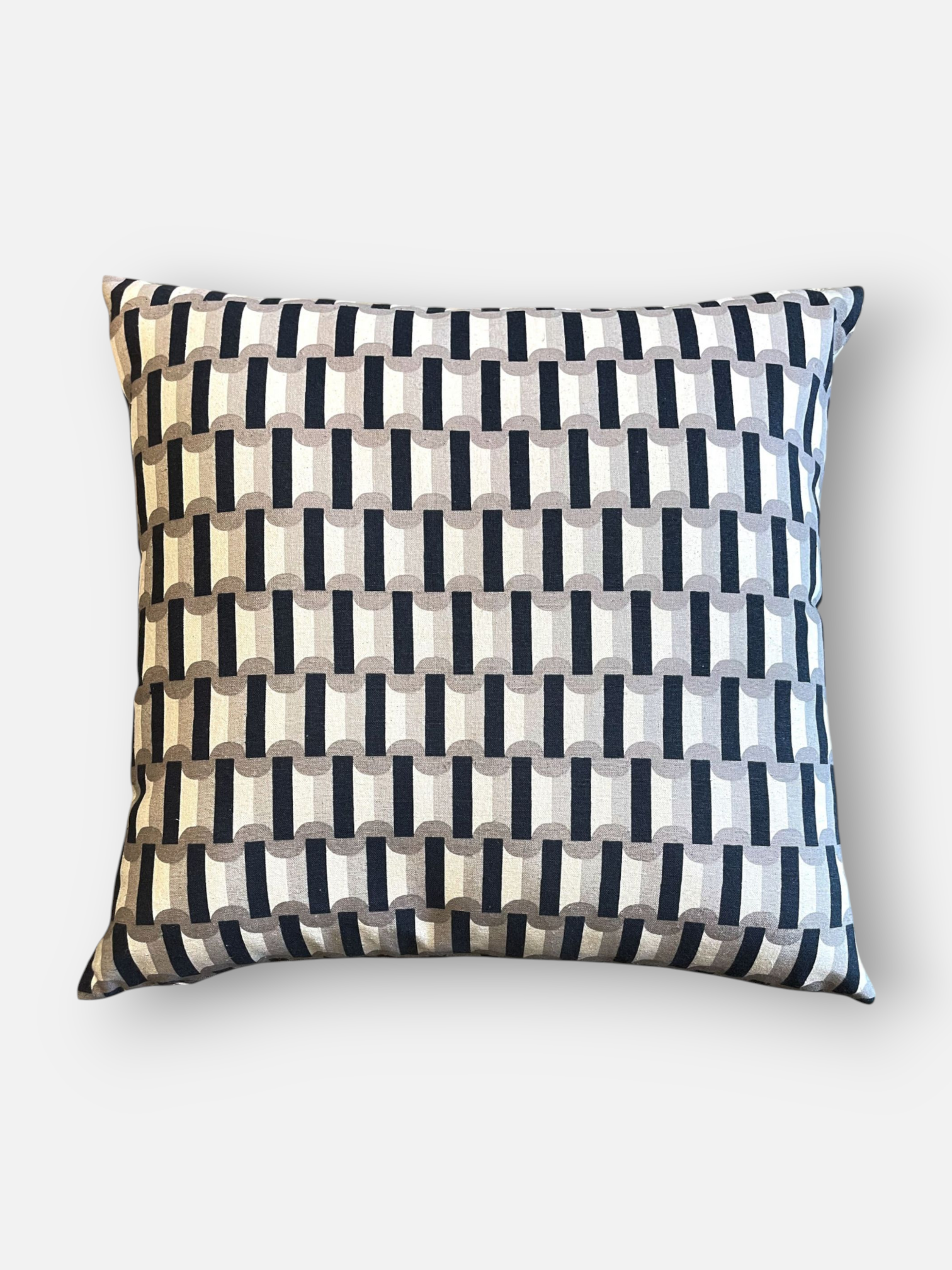 Strike the perfect balance between bold geometry and refined elegance with Rhythm Cushion - a cushion inspired by the timeless sophistication of Art Deco design. Featuring interlocking vertical motifs in deep charcoal, taupe, and ivory tones, this piece creates a sense of movement and harmony that adds depth to any interior. The structured yet fluid pattern makes it a stunning accent for modern, retro-chic, or minimalist spaces. Elevate your décor with a touch of rhythmic luxury that never goes out of style.