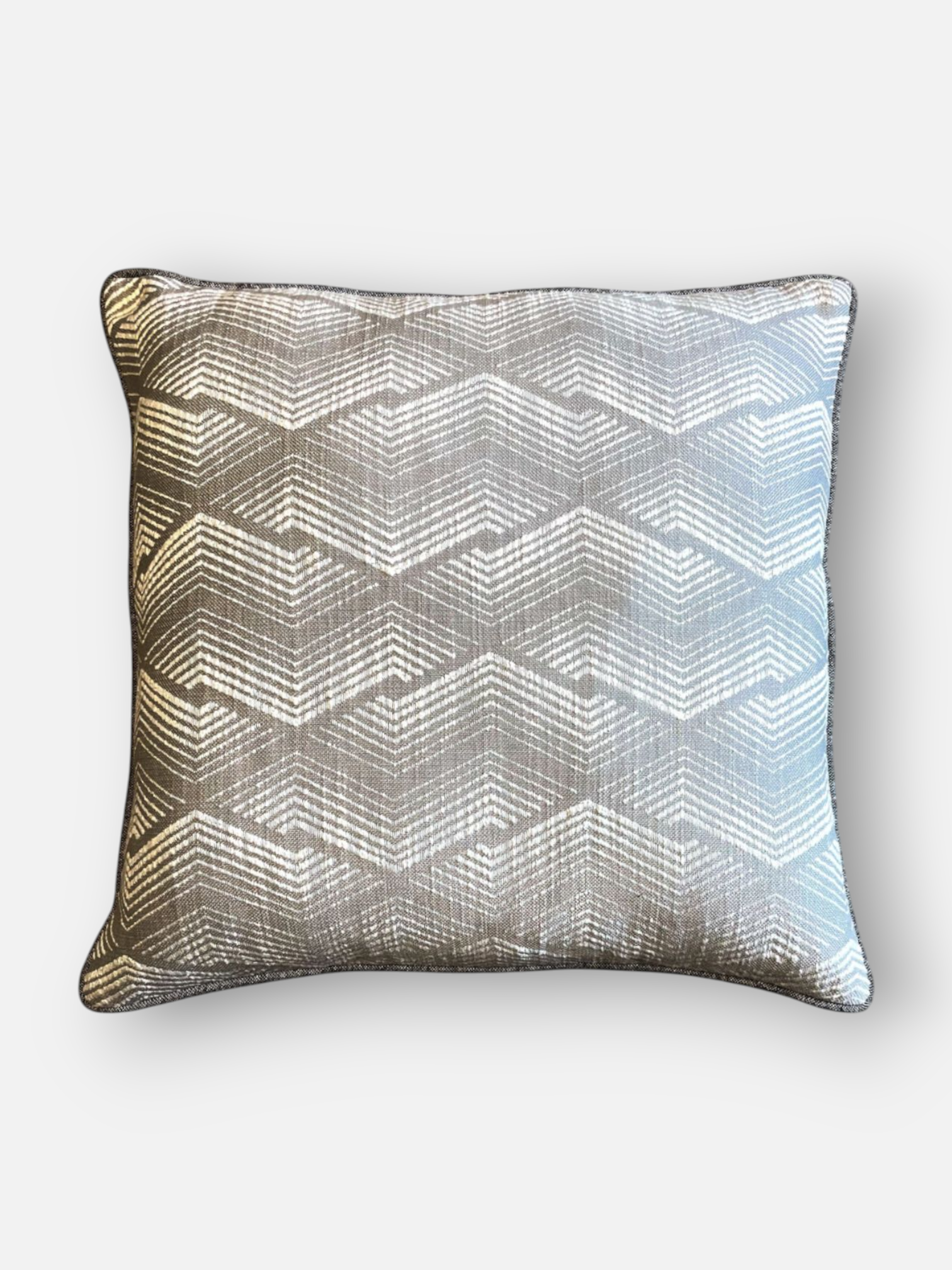 The sleek elegance of Dreslyn cushion. This cushion features a soft grey base overlaid with a shimmering chevron pattern in ivory-white, adding both texture and geometric flair. The subtle sheen and intricate weave make it perfect for contemporary, luxe, or neutral-toned interiors. A statement in understated sophistication.