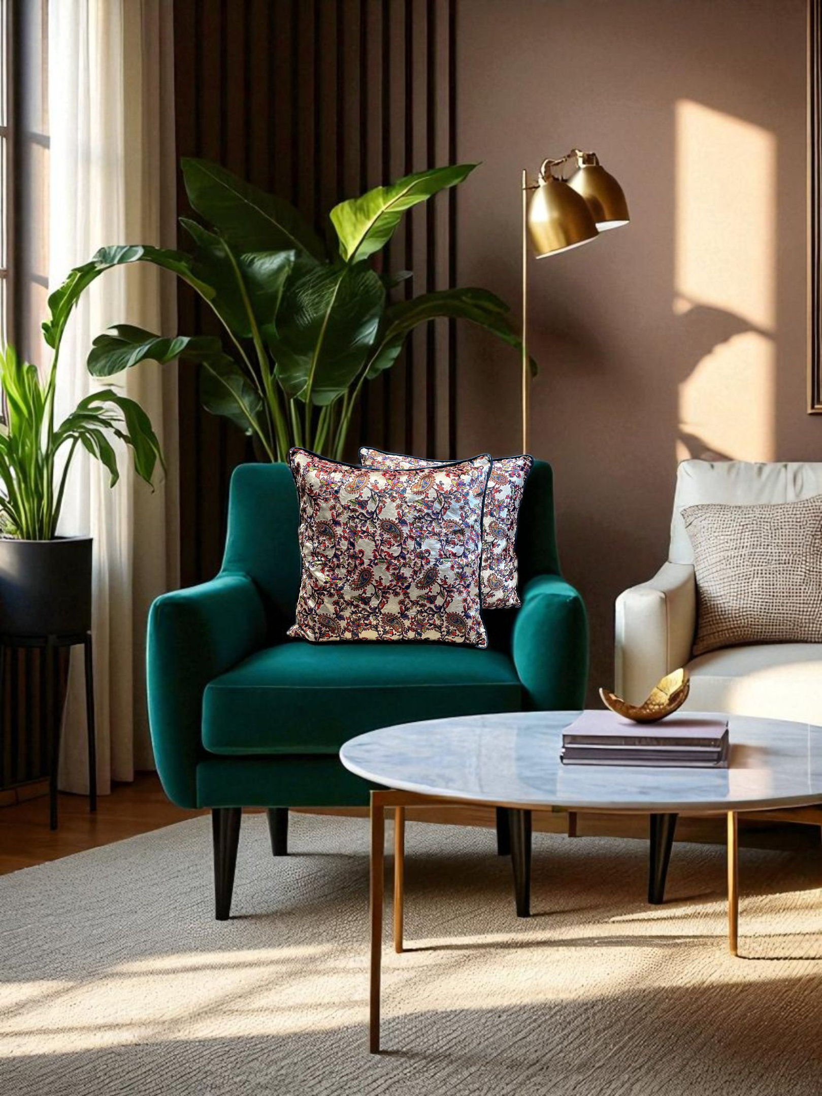 Infuse your living space with regal elegance through the Regalia Cushion. This luxurious accent piece features an opulent floral and paisley tapestry woven in rich tones of ruby, sapphire, and emerald on a pearl-sheen base. The velvet finish adds depth and texture, while the dark piping frames it with sophistication. Perfect for upscale interiors, Regalia Bloom is a statement of timeless artistry and refined taste - where tradition meets modern grandeur.