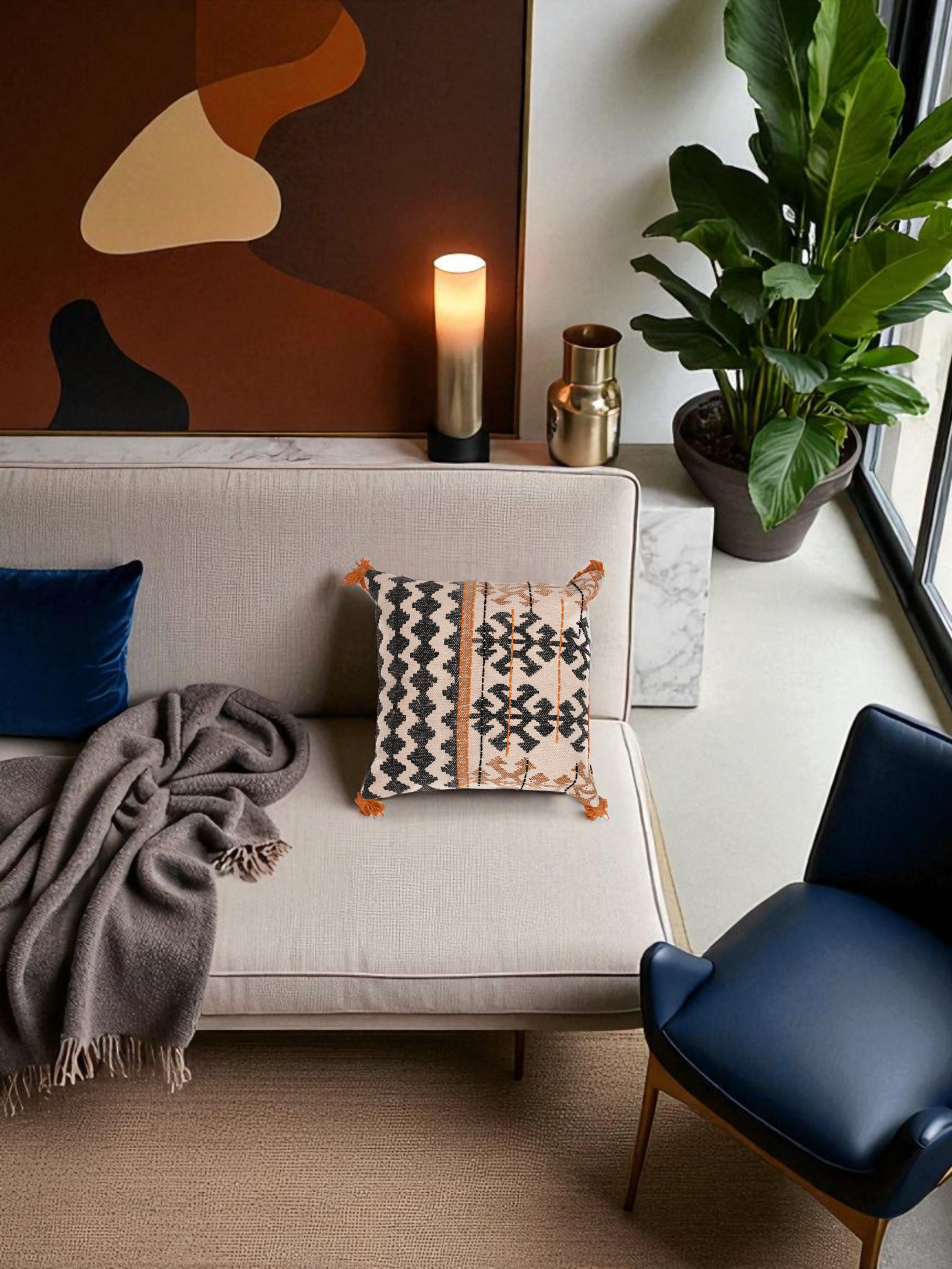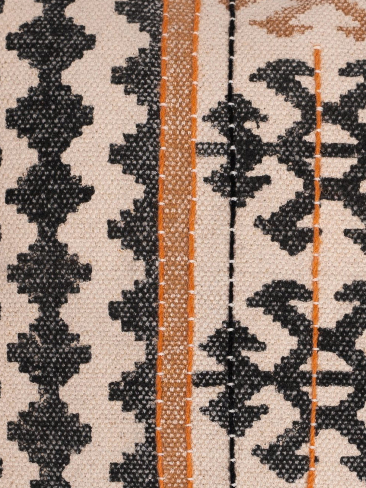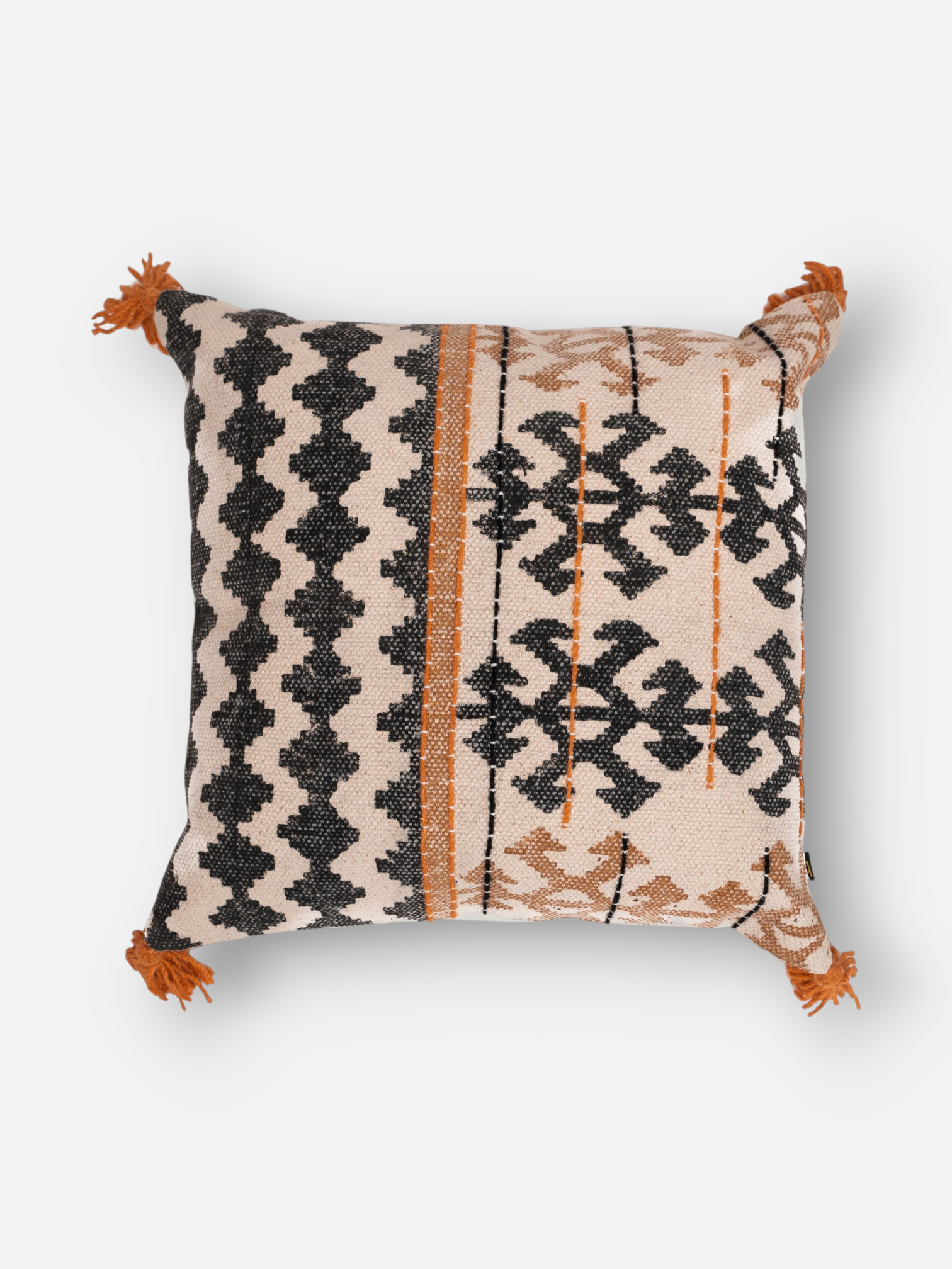Infuse your living space with bold tribal flair through Ritual Cushion. Featuring intricate black and tan geometric patterns, this cushion is framed with playful rust-colored tassels and vibrant orange stitching. Crafted from textured woven fabric, it adds a warm, earthy sophistication to any setting. A statement piece for those who love boho with a refined twist.