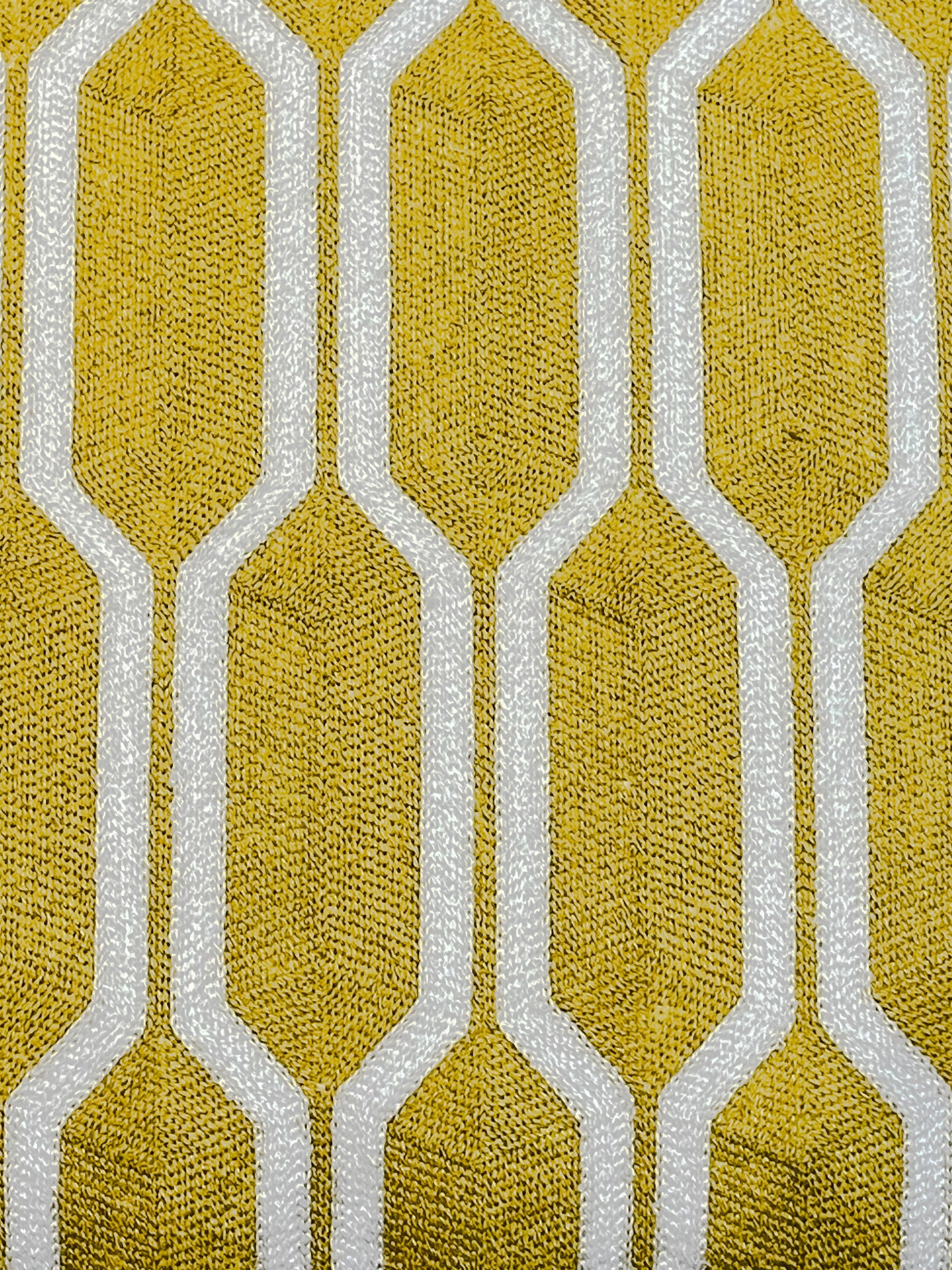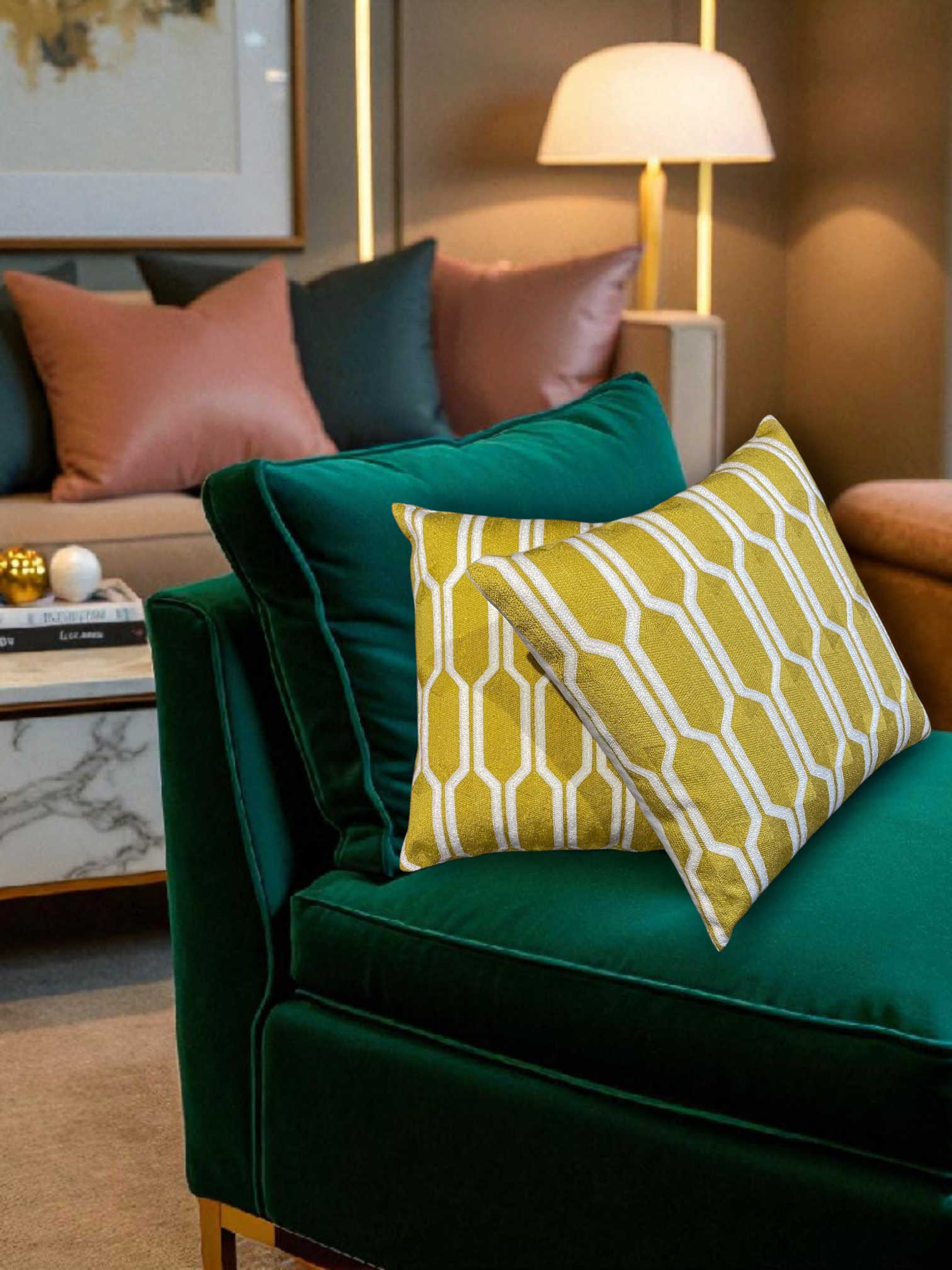 A bold cushion that radiates contemporary elegance. Its golden ochre hue, interwoven with sleek ivory geometric lines, brings a vibrant yet sophisticated charm to any interior. Crafted from high-quality textured fabric, it offers both visual intrigue and plush comfort. Perfect for modern settings that crave a touch of structured luxury.