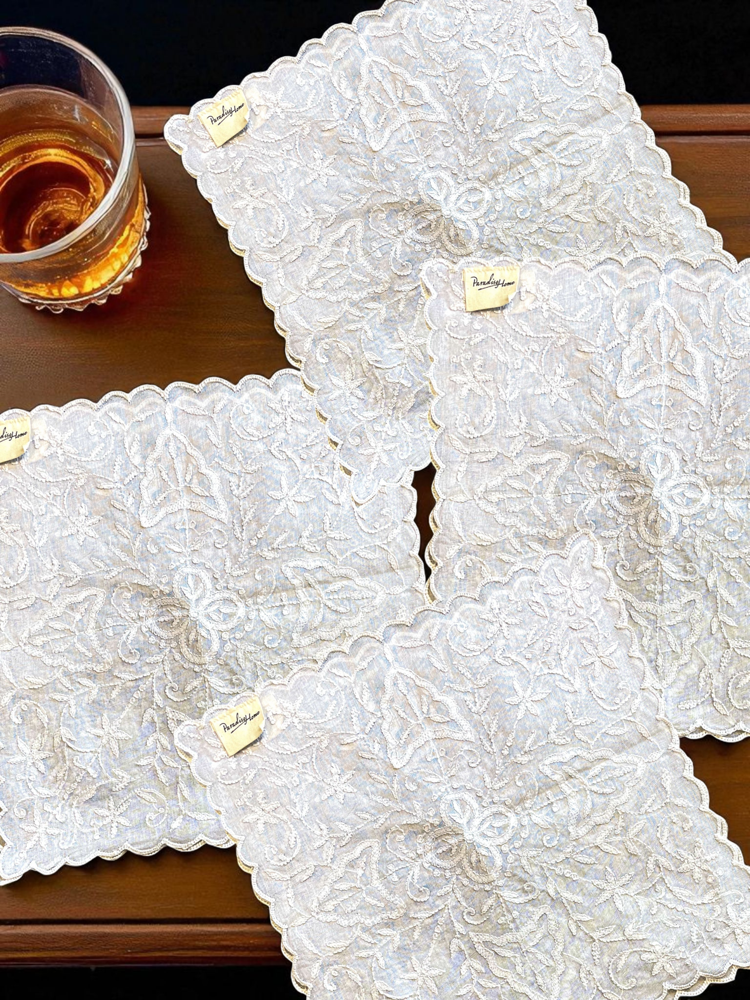Crafted with exquisite precision, this Cocktail napkin transforms any table setting into a statement of refined elegance. The intricate embroidery and delicate floral motifs speak to a timeless artistry, while the soft white palette adds a serene, luxurious touch. Perfect for intimate grand celebrations, it embodies sophistication and heritage in every stitch. Elevate your experience with this masterpiece of craftsmanship and style.