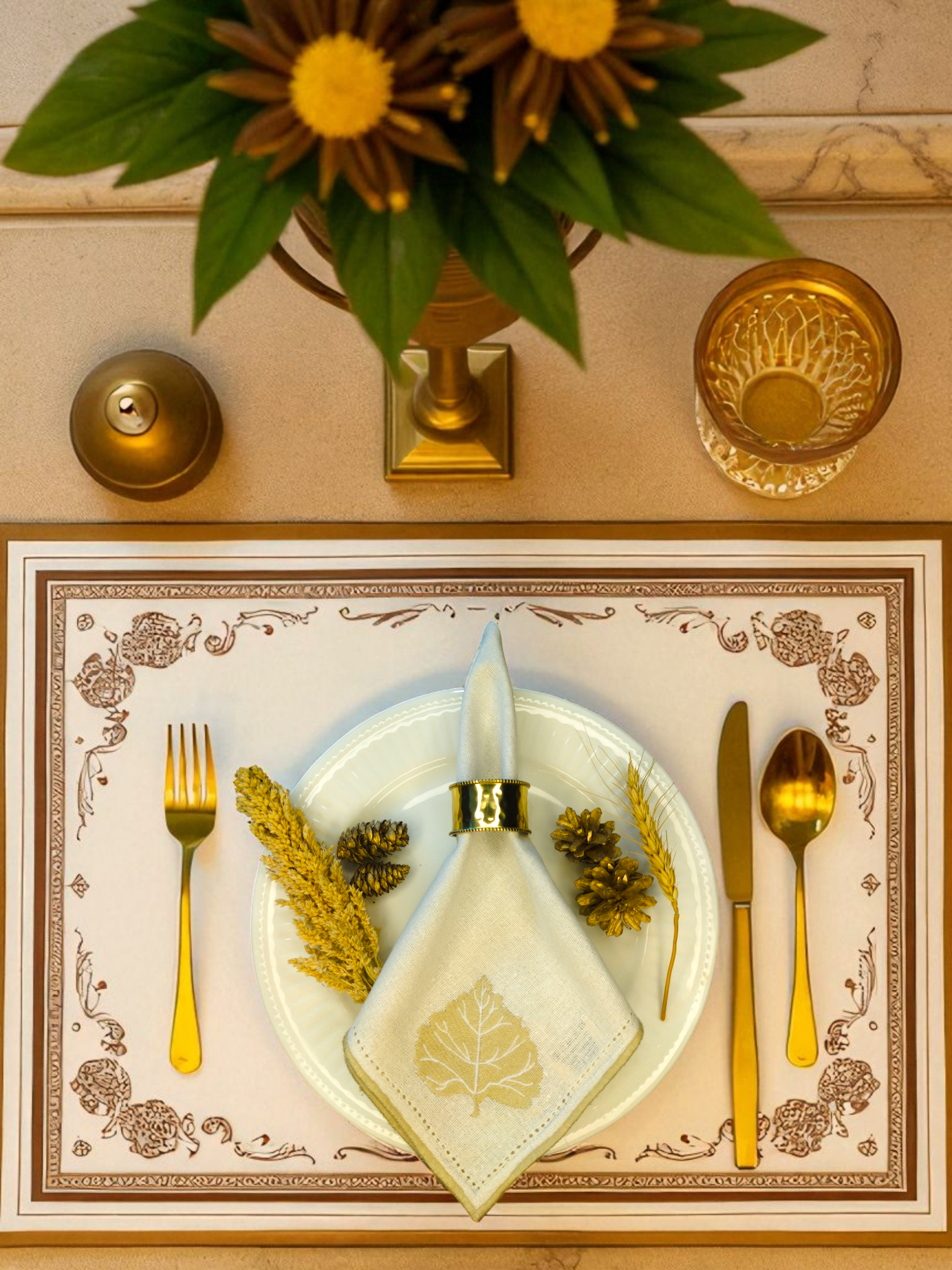 Grace every table setting with the timeless beauty of Lumora napkin - a napkin that whispers elegance in every thread. Crafted with exquisite detail, its soft champagne gold fabric is adorned with a delicate golden leaf motif, inspired by nature’s quiet luxury. The stitched borders and shimmering hues evoke refined artistry and understated opulence. Perfect for soirées, holiday feasts, or intimate fine dining, this piece transforms your table into a gallery of grace