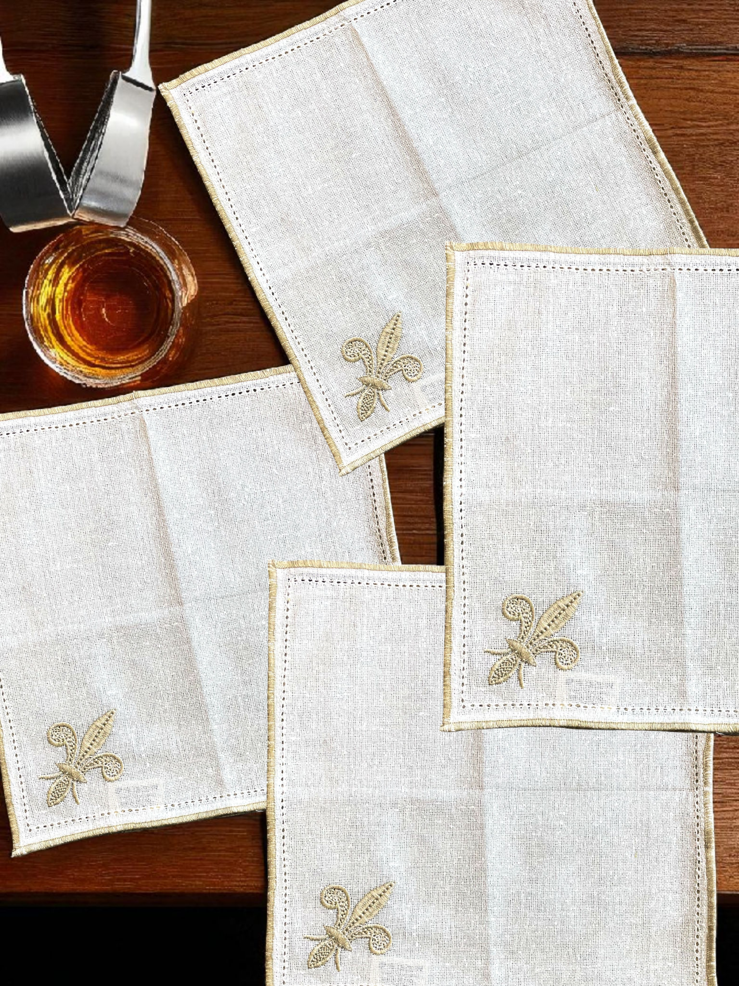 Unfold refined elegance with Bellegrade cocktail napkin, a napkin that seamlessly blends heritage craftsmanship with modern luxury. Woven from premium fabric and detailed with a subtle yet regal fleur-de-lis embroidery, each piece evokes the charm of European aristocracy. Finished with delicate hemstitching and a soft golden border, it is perfect for occasions where beauty lies in the details. Elevate your tablescape with timeless sophistication.