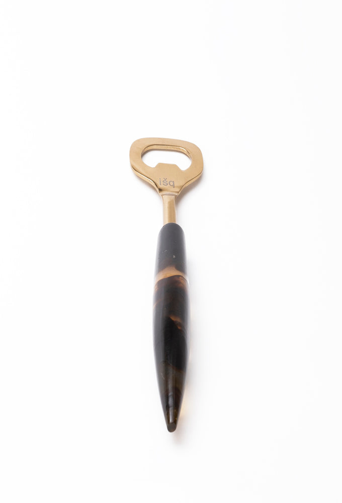 This bottle opener is handcrafted with stainless steel in gold finish and resin. The multi colour amber hues design in the handle gives it this set an uber luxe look.