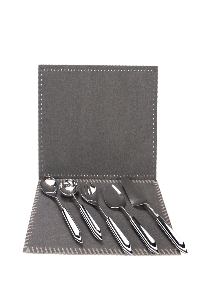 A set of 5 serving set, this set is handcrafted with stainless steel and resin. The monochrome handle gives this set an uber luxe look. This serving set would be a perfect choice of accessory for gracing your dinning table.