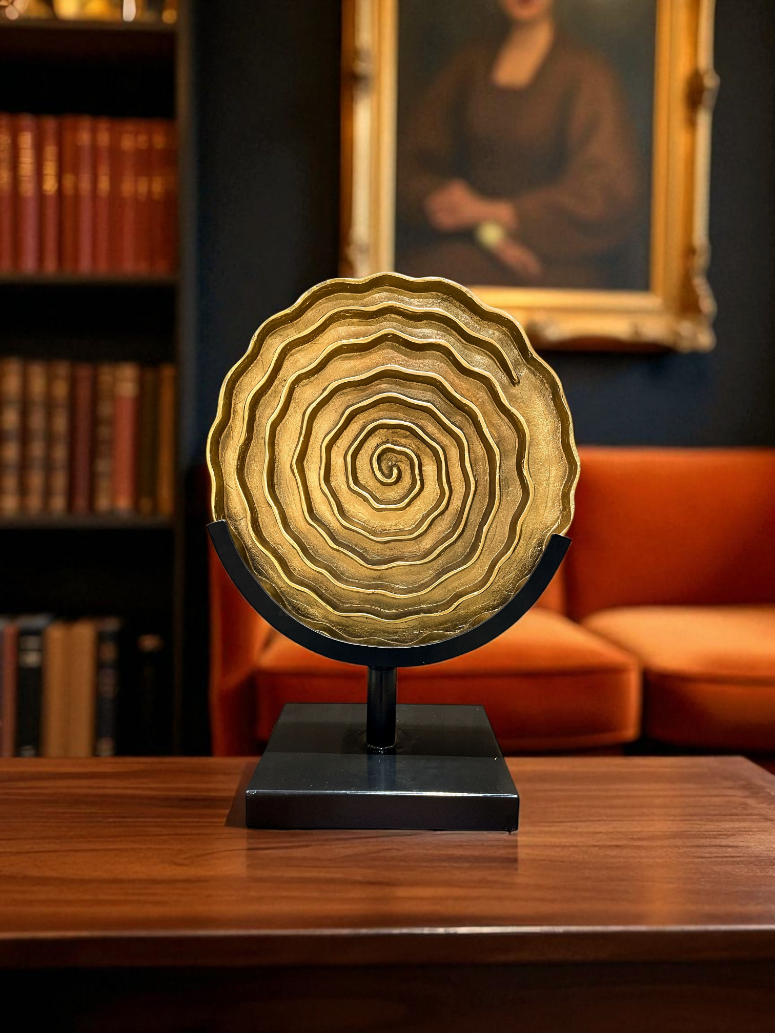 Elevate your space with this exquisite golden spiral sculpture, a symbol of eternity and flow. Meticulously crafted with undulating ridges that capture light in a mesmerizing play of shadows and highlights, this piece embodies both luxury and timeless elegance. Mounted on a sleek black base, it seamlessly blends modern minimalism with classic artistry, making it a statement centerpiece for any refined interior.