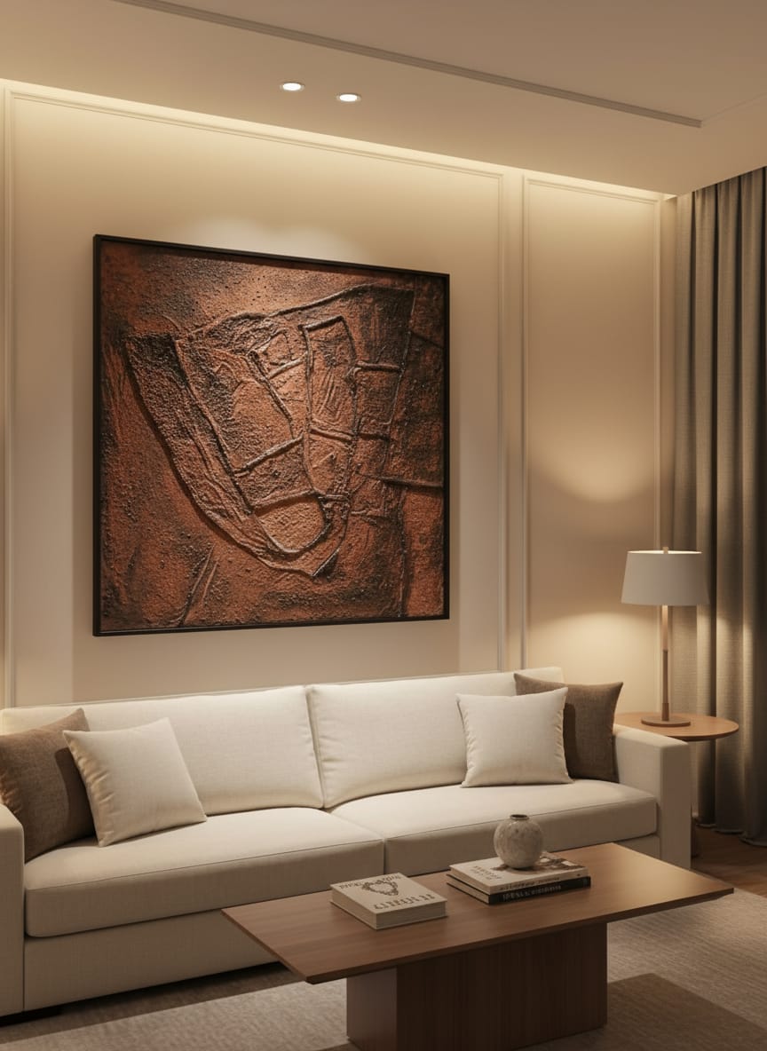 Elevate your space with Earthscape Art - a 37" x 37" handcrafted wall art piece where abstract geometry meets modern tactility. The layered, plush surface creates dimensional intrigue with intersecting circles and blocks, evoking a quiet rhythm in earthy rust, cream, and deep charcoal. Perfectly balanced between bold design and soft texture, this piece adds a warm, artful presence to contemporary interiors. Let your wall speak in curves, shadows, and texture.