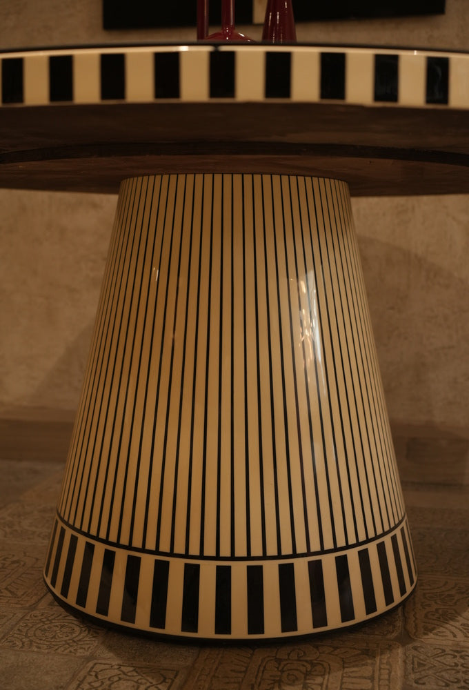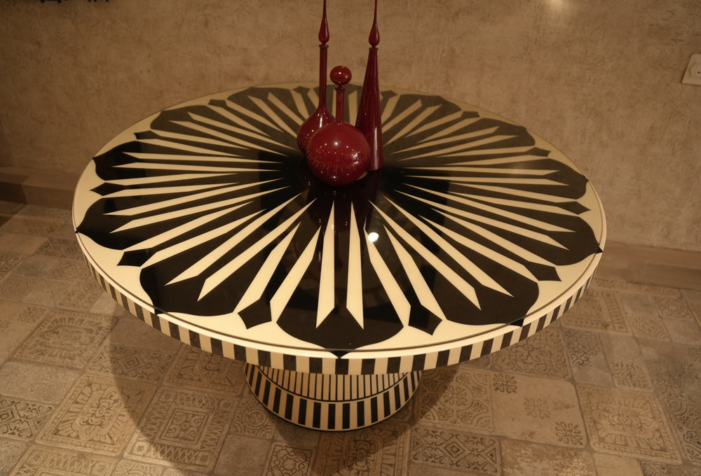 An inlay is a technique of inserting pieces of contrasting material into depressions made on a base object. The production of bone inlay furniture is a three-step process and requires up to a month to create. First, the fragments of camel bones are shaped delicately. Then these intricate shapes are affixed onto the timber frame in a detailed pattern. After this, the resin is filled around the bone shapes to craft the background. The bone pieces are offset by the striking color of the resin to create an exotic looking oriental piece of furniture.