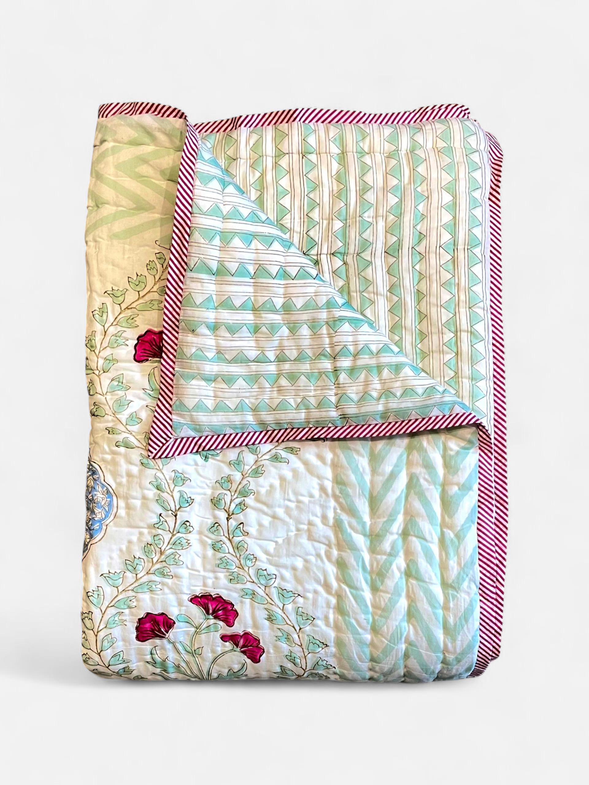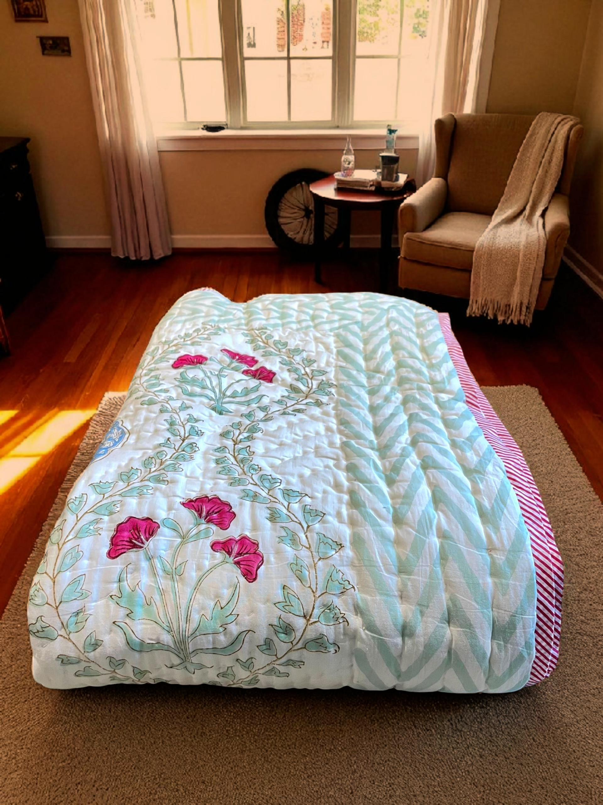 Wrap yourself in the elegance of this handcrafted comforter, a stunning fusion of floral beauty and geometric precision. Adorned with delicate blooms in vibrant hues against a soft pastel backdrop, the luxurious design is complemented by a refined striped border for a contemporary twist. Expertly quilted for warmth and comfort, this comforter promises to elevate your bedroom with timeless charm and unmatched quality.