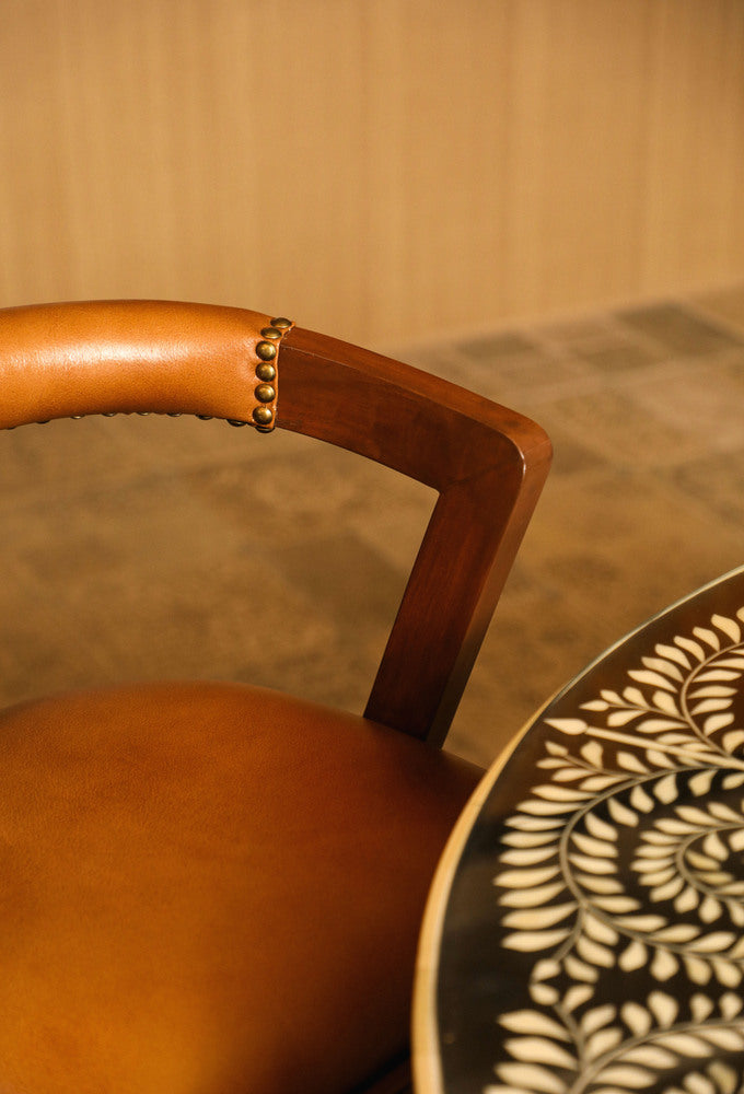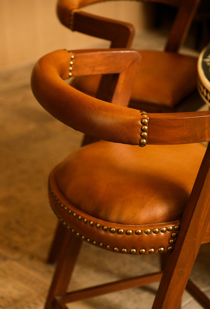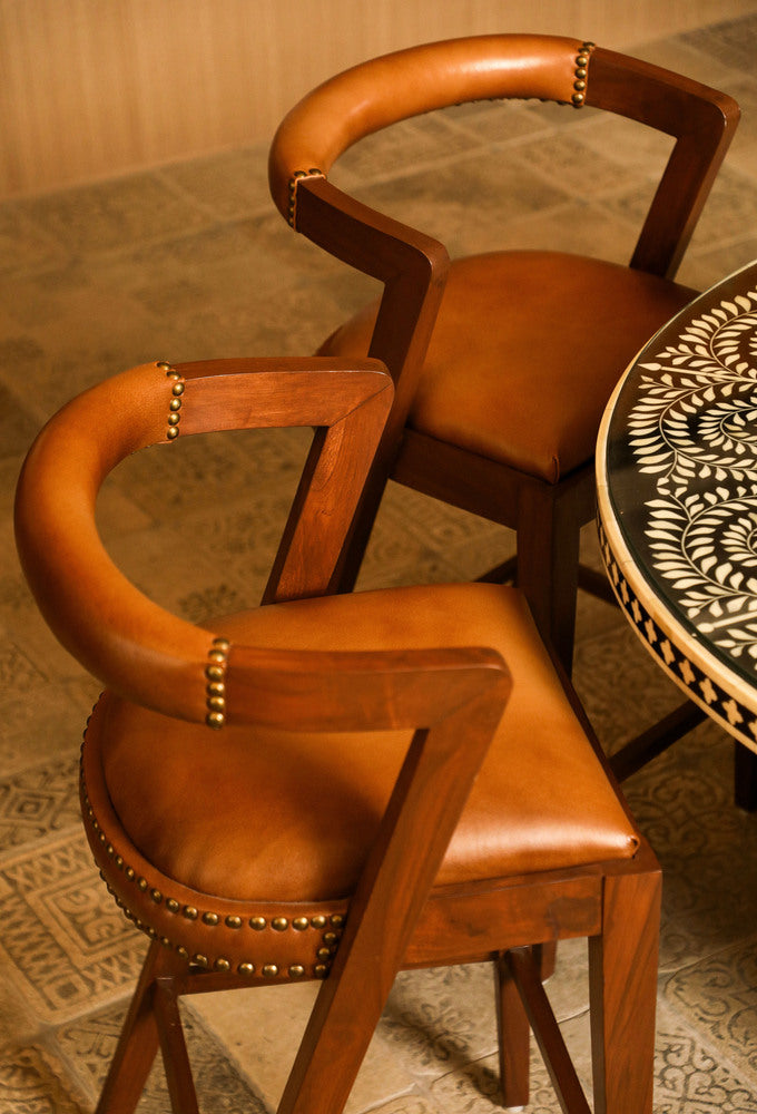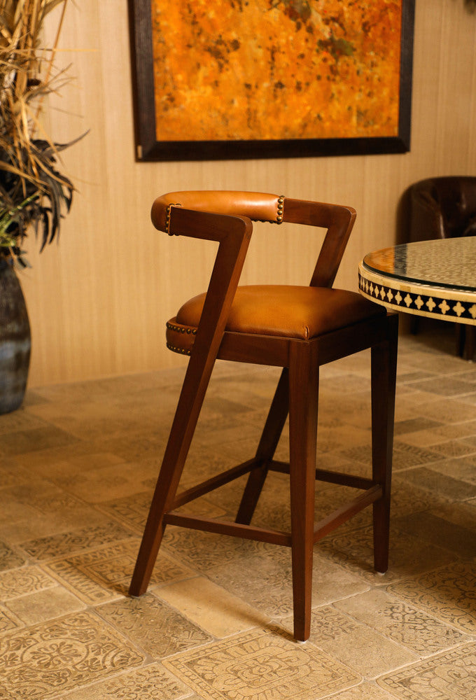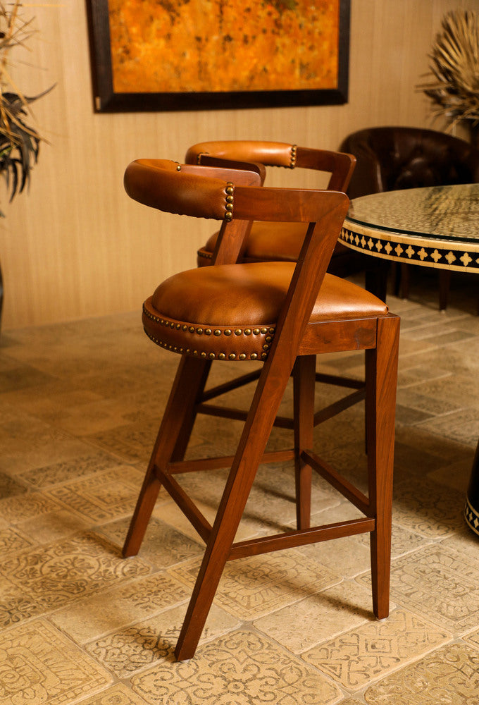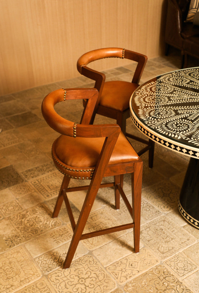 ATHENA BAR STOOL A classic leather and wood combination, is perfect for home office, living room, or dining room. Made in genuine top-grain leather with a waxy finish, with a solid teak wood frame & offered in Brown, the chair makes a perfect accompaniment to the living room, dining room, bedroom, or home office.