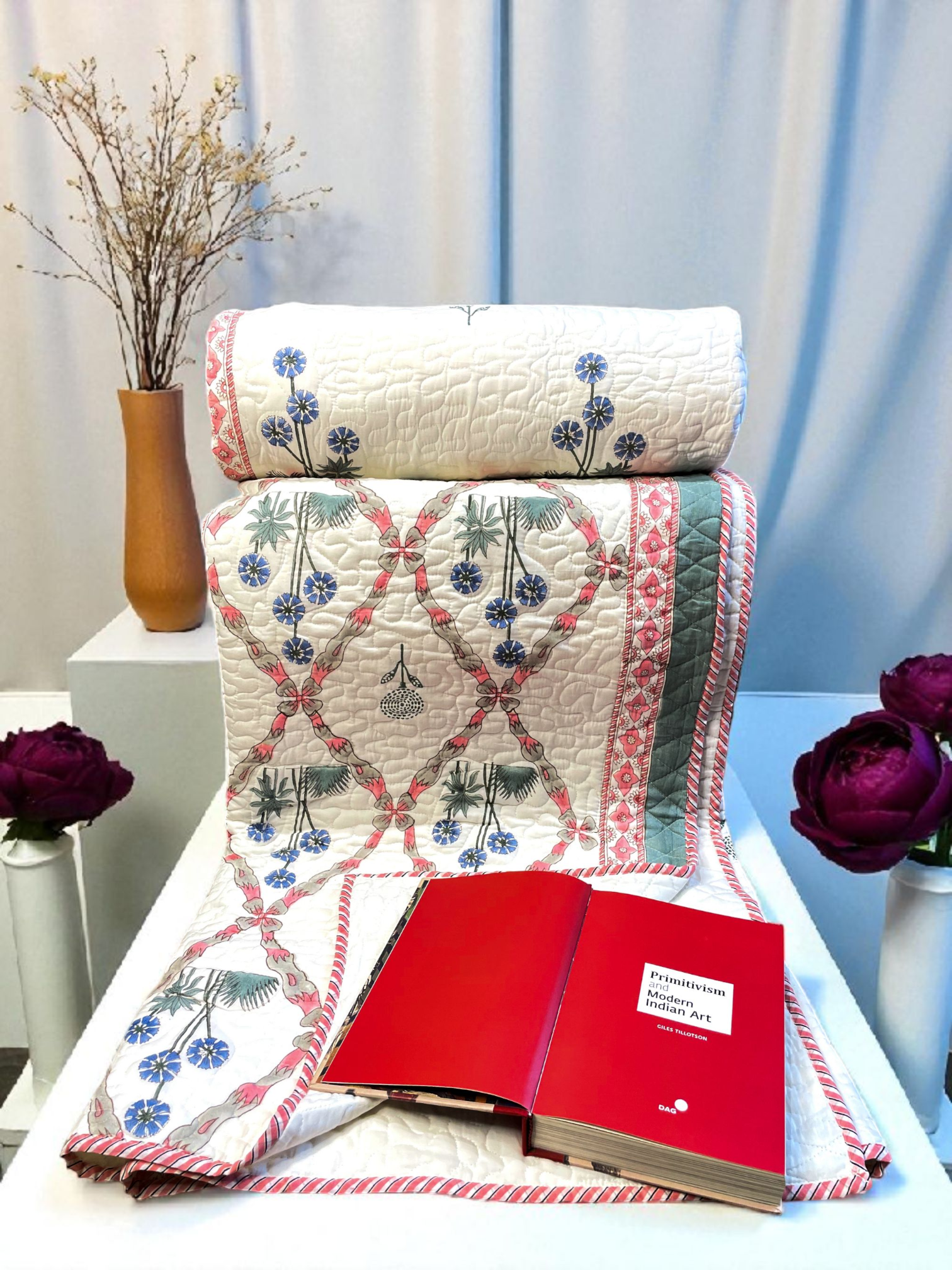 Wrap yourself in elegance with our handcrafted quilted bedspread, a dreamy fusion of comfort and artistry. Featuring intricate blue floral motifs framed in blush red latticework, this piece evokes the charm of vintage botanical prints with a modern twist. Finished with delicately striped borders and soft quilted waves, it brings warmth and sophistication to any space. A true statement in luxurious sleep styling.