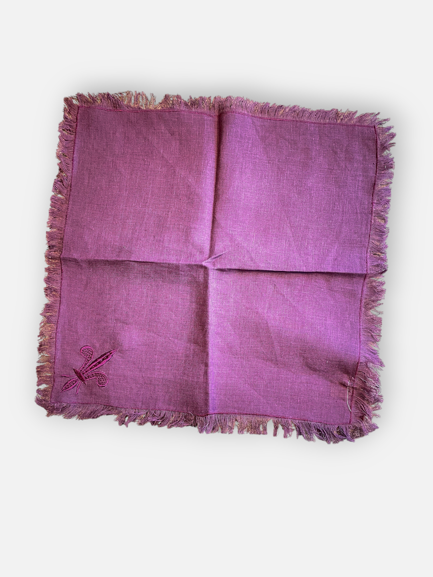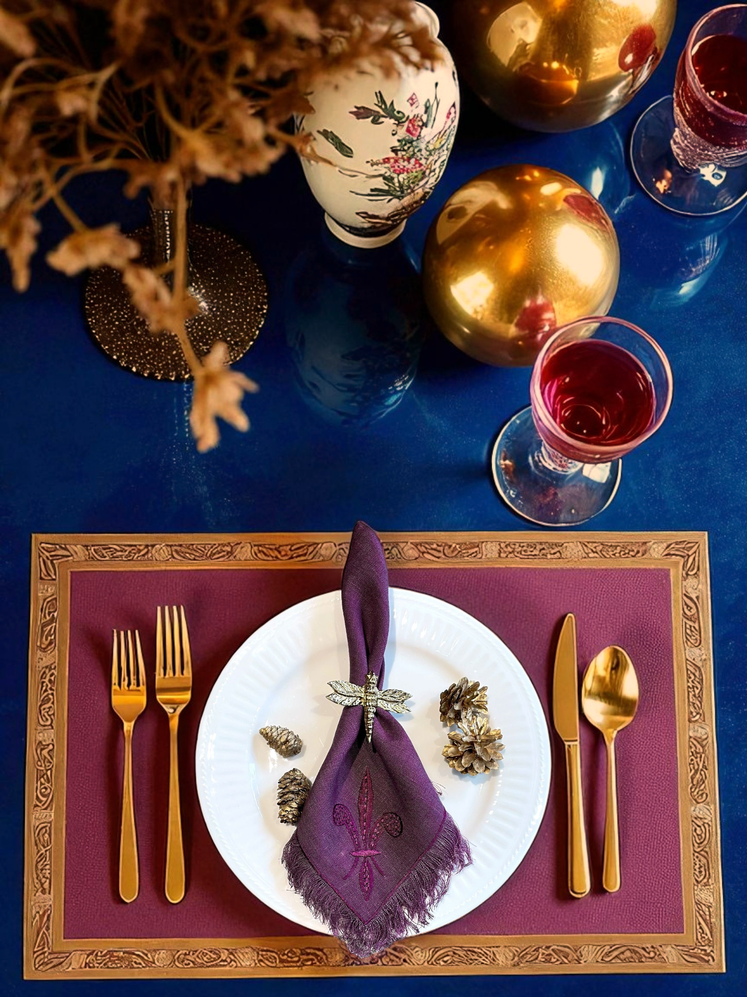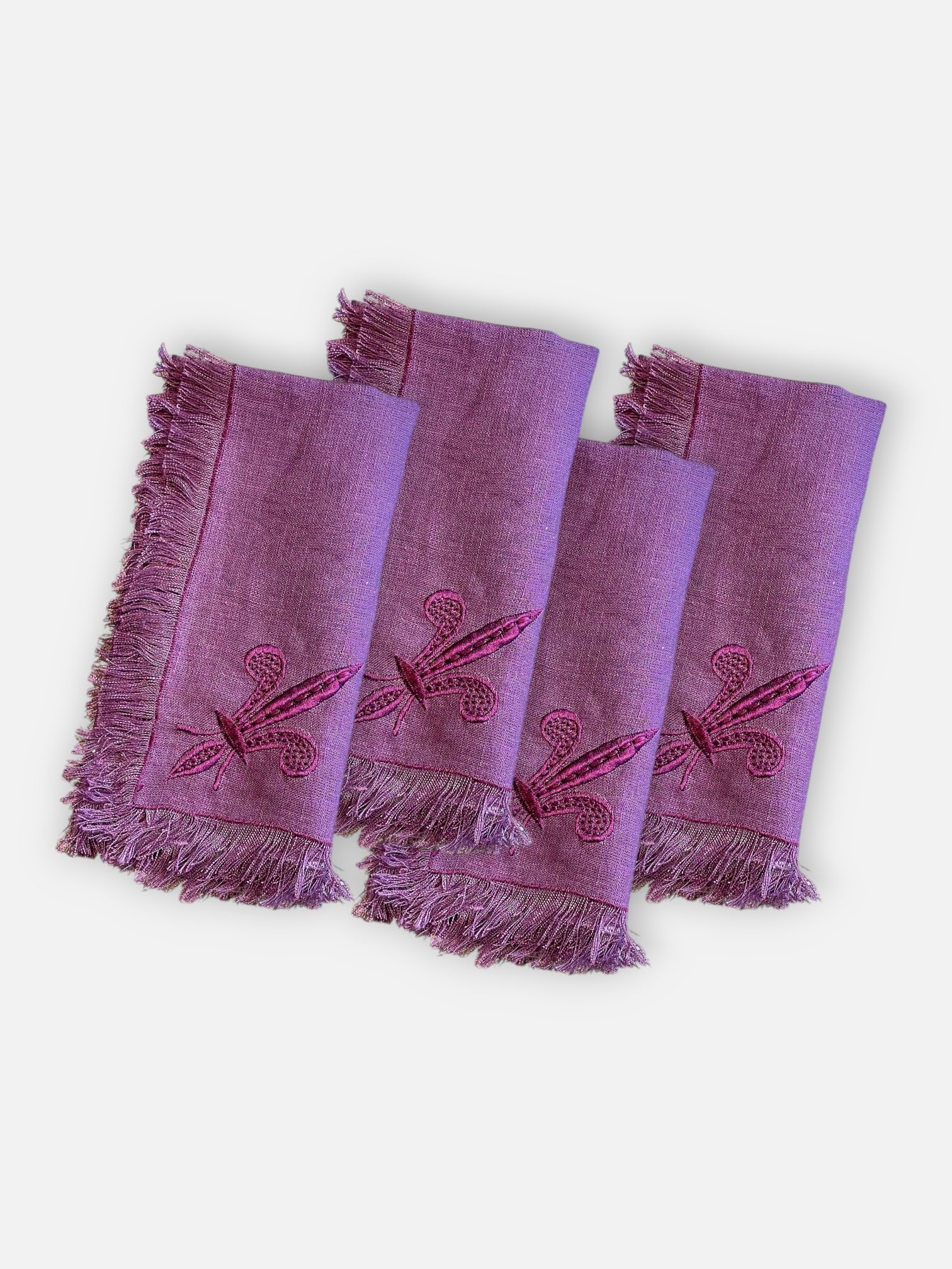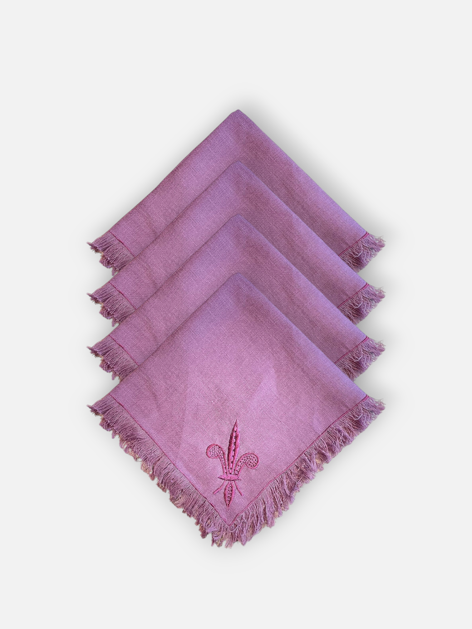 Elevate your table with timeless refinement. Our Lavender Rose Napkin features delicate fringed edges and an exquisite embroidered fleur-de-lis - symbolizing grace and nobility. Handcrafted from fine-textured fabric, this piece brings a touch of French heritage and artisanal beauty to every dining occasion. Where craftsmanship meets couture - your tablescape begins here.