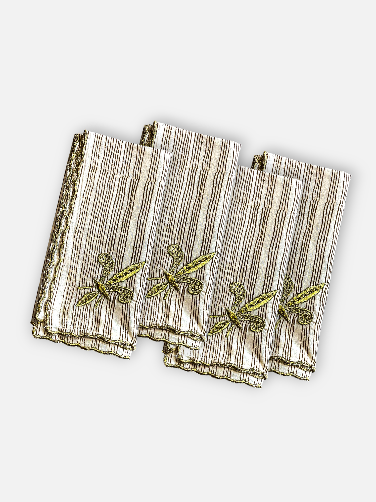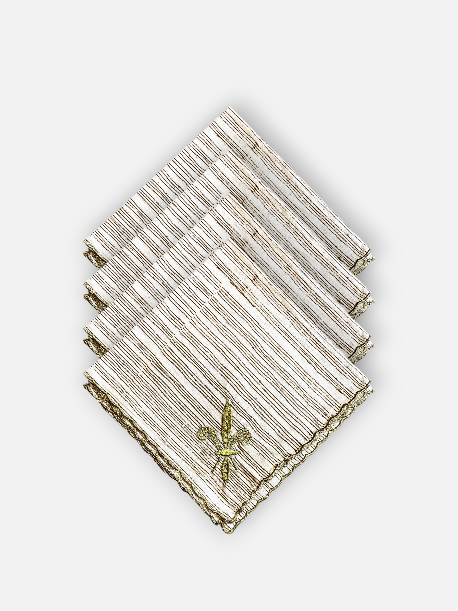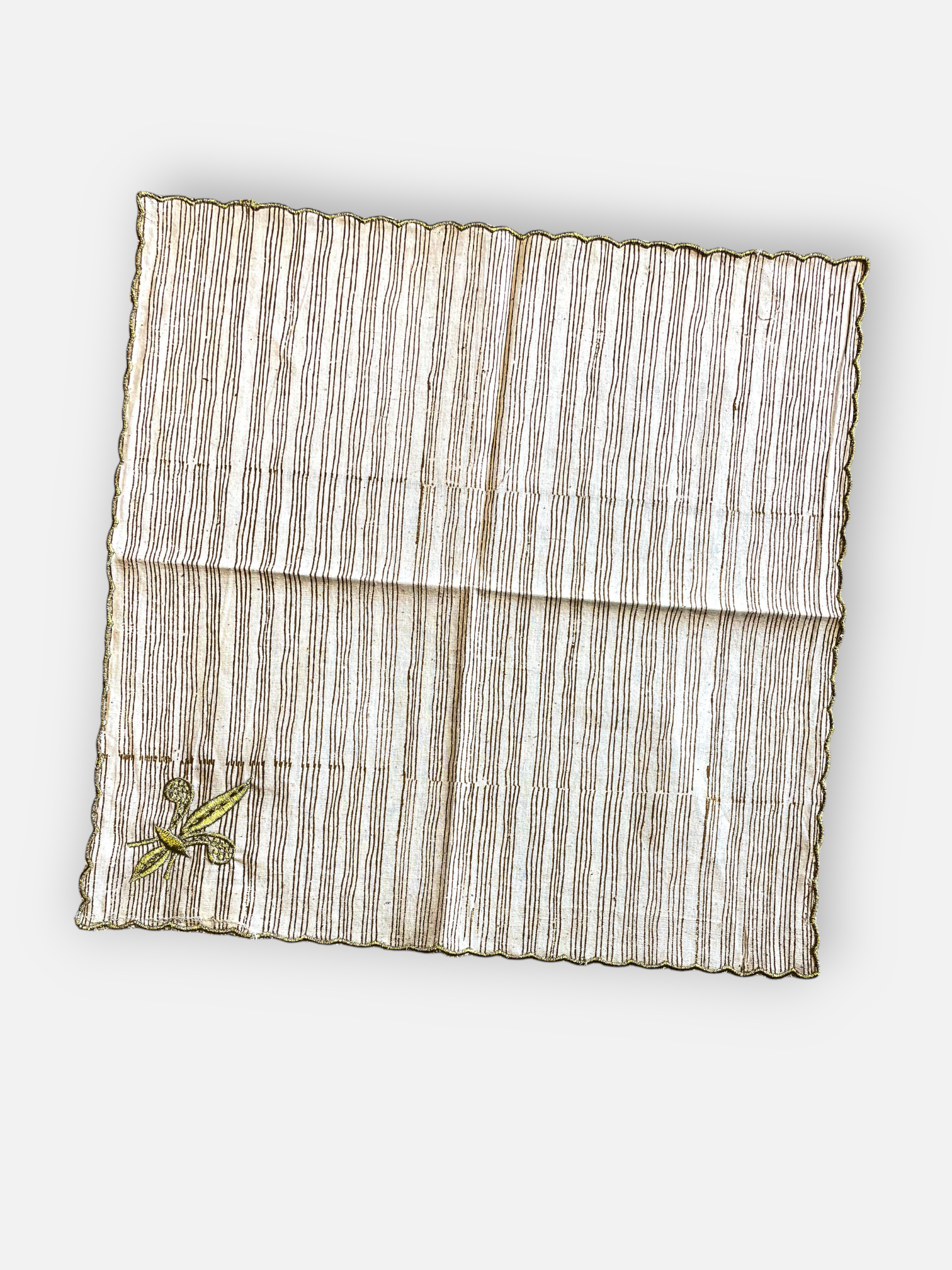 Elevate your dining experience with Vellura stripe napkin, a handcrafted napkin where artistry meets refinement. Woven from soft ivory fabric adorned with graceful brown pinstripes, this piece is finished with an intricate olive motif and golden scalloped edges. Inspired by timeless European table traditions, it brings a quiet opulence to any setting. Perfect for those who appreciate understated elegance with artisanal soul.