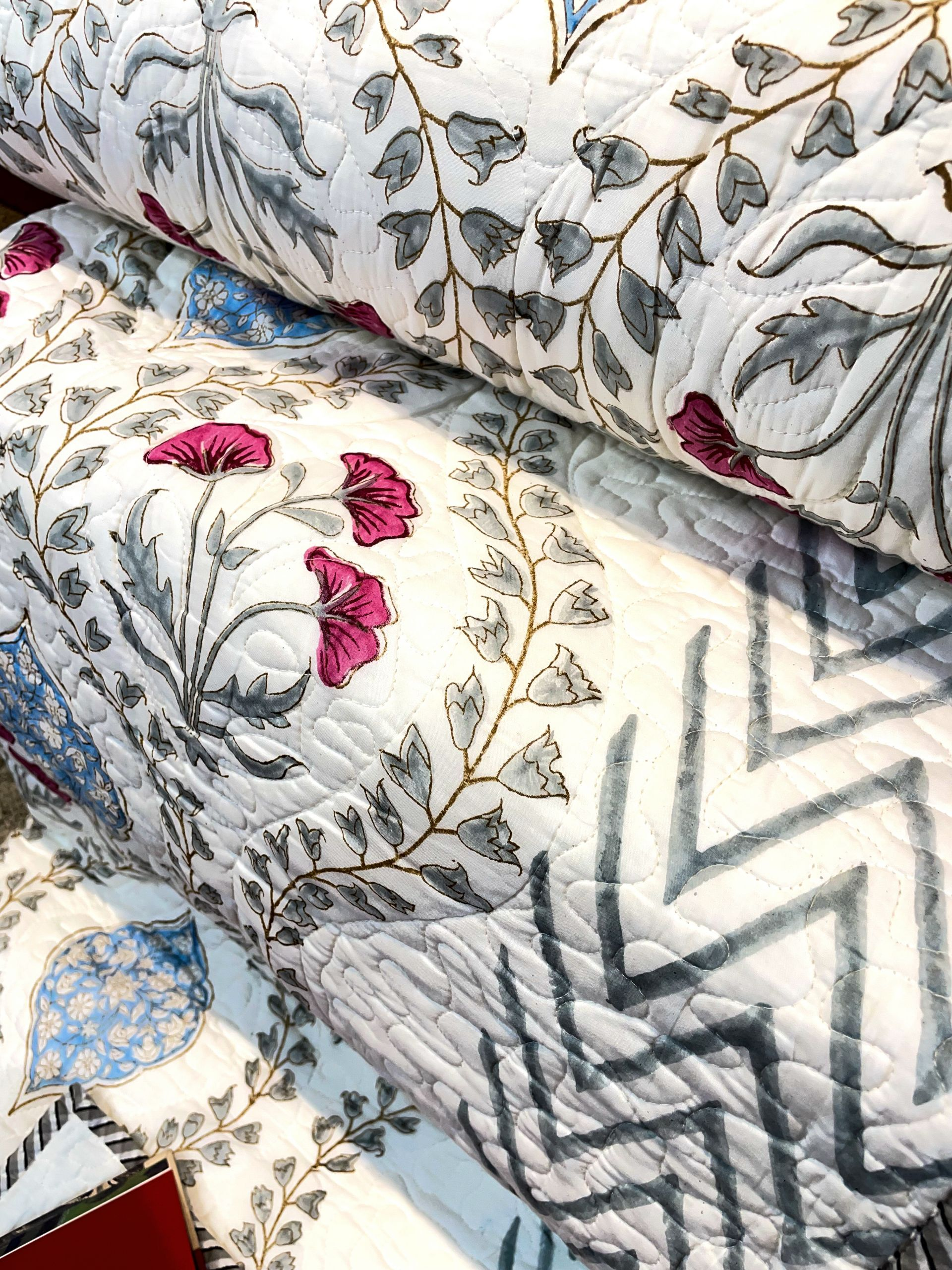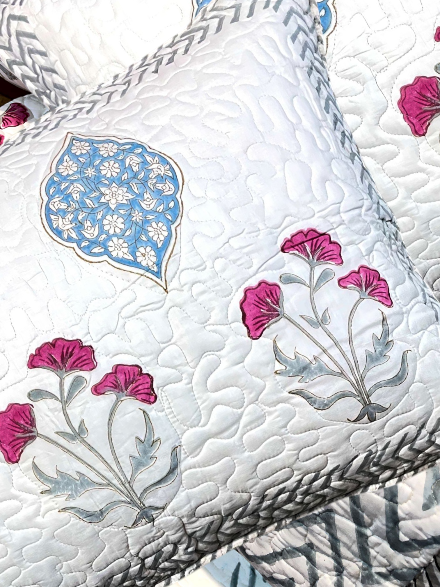 Wrap yourself in botanical luxury with our handcrafted quilted bedspread, adorned in soft florals and intricate Mughal-inspired vines. With hues of ivory, blush pink, and sky blue set against elegant chevrons, it’s the perfect blend of heritage and harmony. The lightly padded texture and delicate stitching add warmth without weight. A timeless piece that transforms your bedroom into a serene sanctuary.