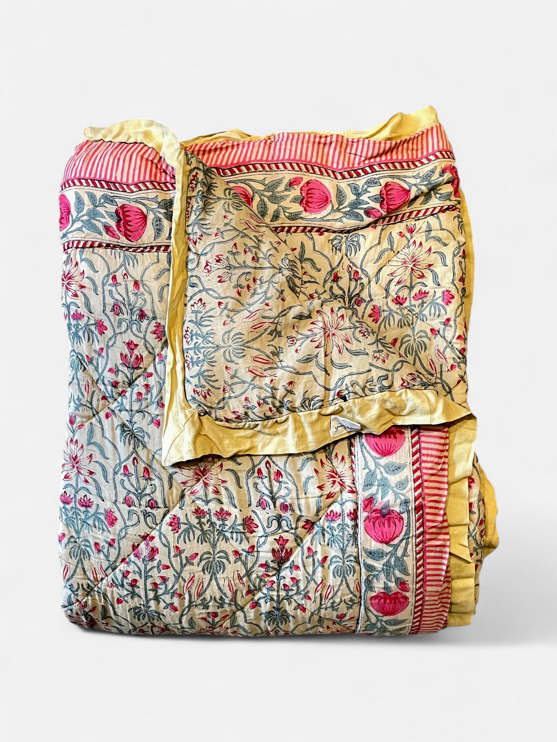 Wrap yourself in the exquisite craftsmanship of this Handcrafted Quilted Comforter. Featuring a harmonious blend of delicate floral patterns with vibrant red and subtle blue tones, it offers not only warmth but a touch of regal elegance to your space. The intricate quilting design, complemented by a soft yellow striped border, exudes luxurious charm. Made with premium materials and an eye for detail, this comforter brings comfort and artistry into your bedroom.