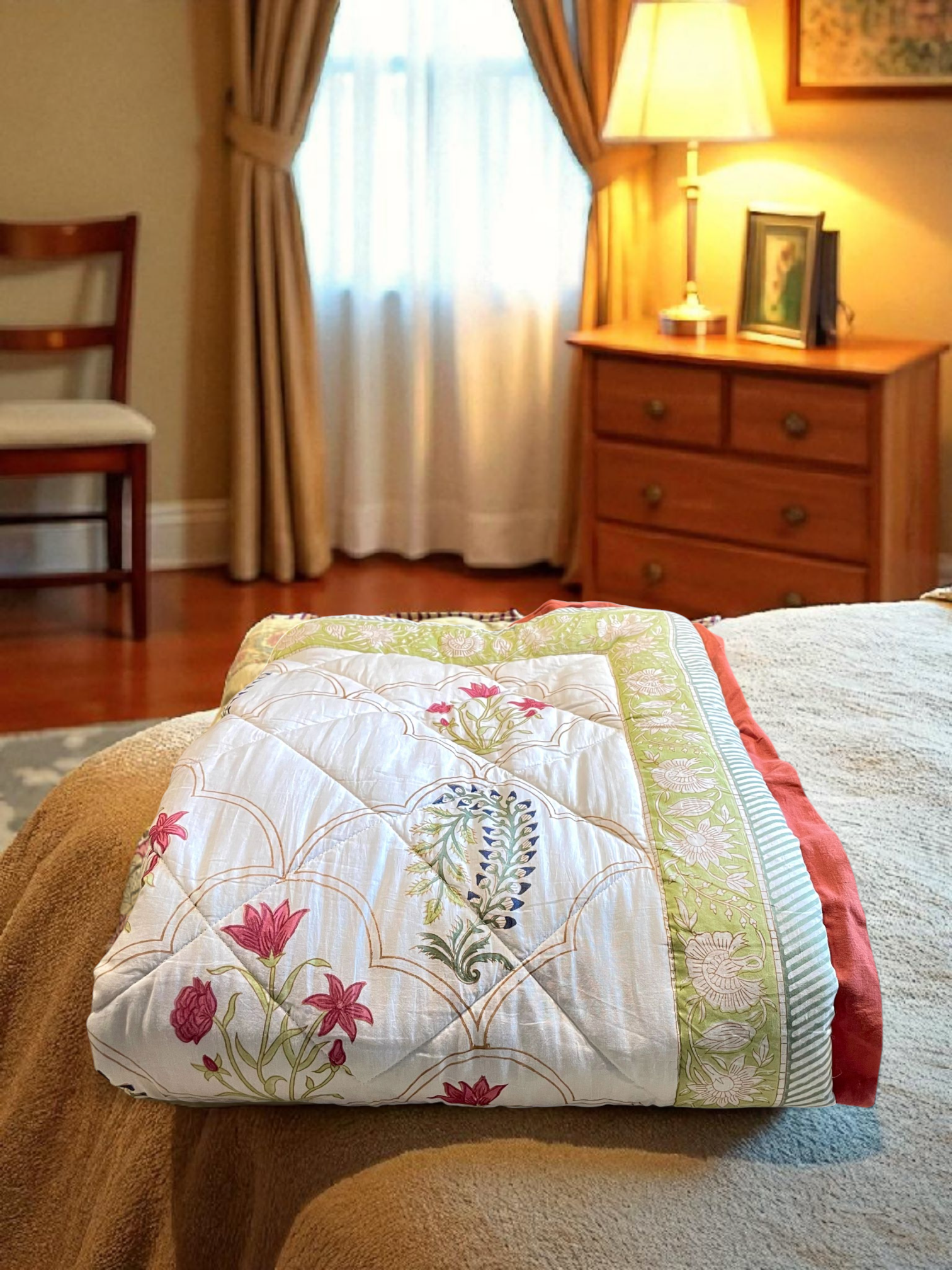 Our hand block printed cotton quilt or Jaipuri razai is designed to enrich your sleeping experience with unrivaled comfort and style. Crafted from fine cotton fabric, this single quilt is exceptionally soft. As with most Jaipuri razais, this quilt is reversible with different hand block printed patterns on either side. The breathable cotton material promotes optimal airflow, keeping you comfortable throughout the night. Lightweight yet warm, this quilt is the perfect AC blanket and its beautiful floral motifs add a delicate allure to any bedroom decor. Hand block printing is a traditional textile art form that involves the manual application of intricate designs onto fabric using carved wooden blocks. It is a highly skilled craft that has been practiced for centuries in India.