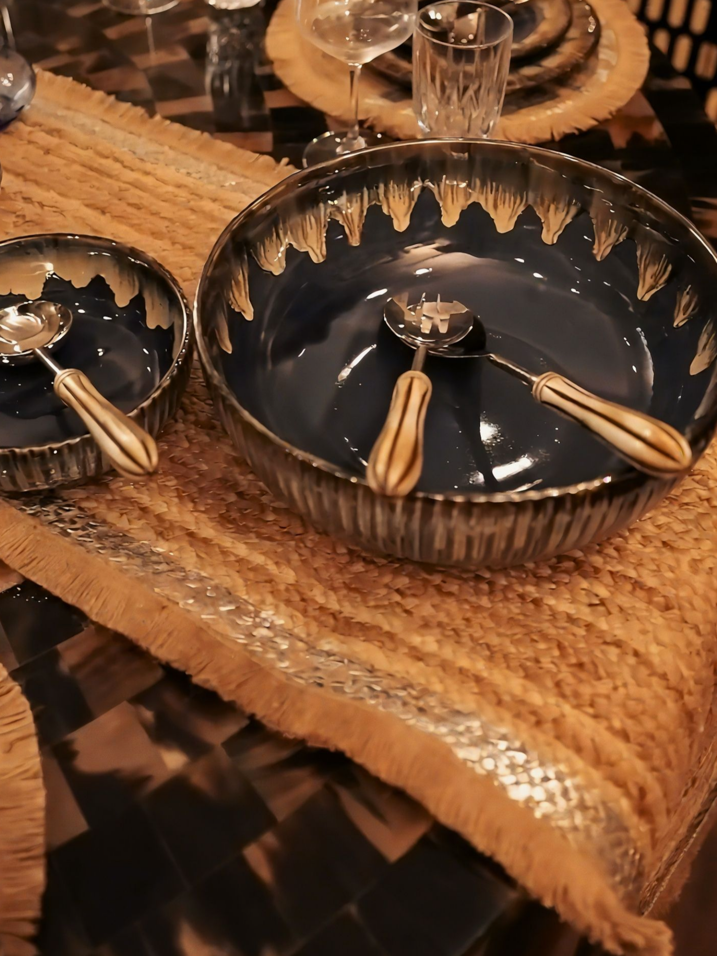 Elevate your dining aesthetic with this handcrafted woven runner, a blend of natural elegance and subtle sophistication. The organic texture, paired with golden undertones and soft silvery hues, brings effortless luxury to any table setting. Durable and stylish, it’s perfect for both everyday use and special gatherings. Finished with delicate fringe edges, it’s where earthy charm meets refined design.