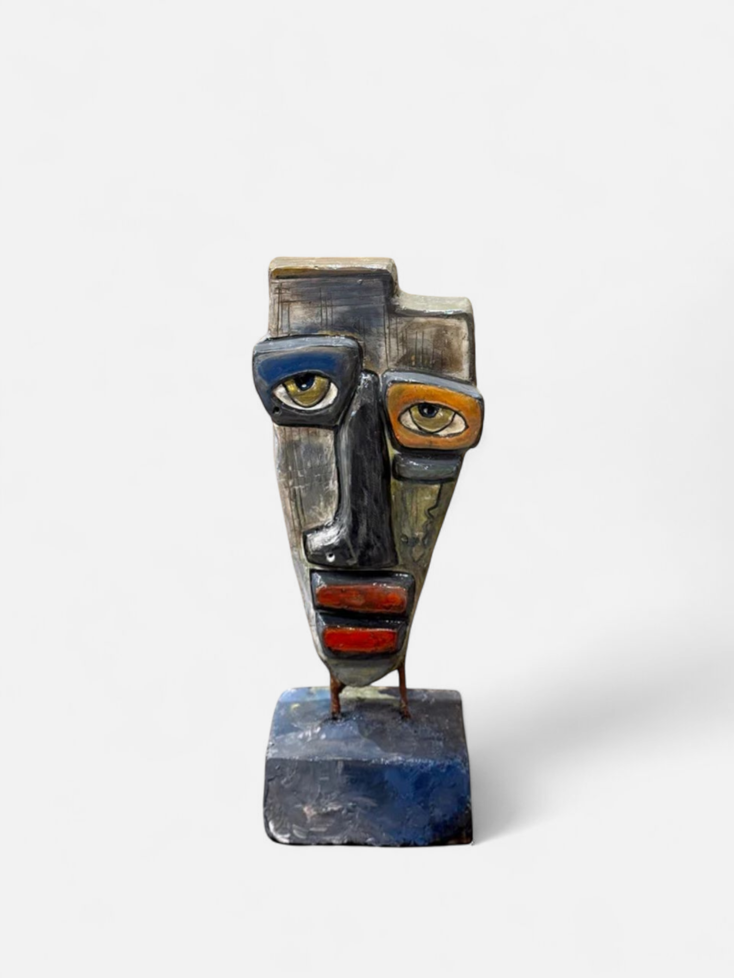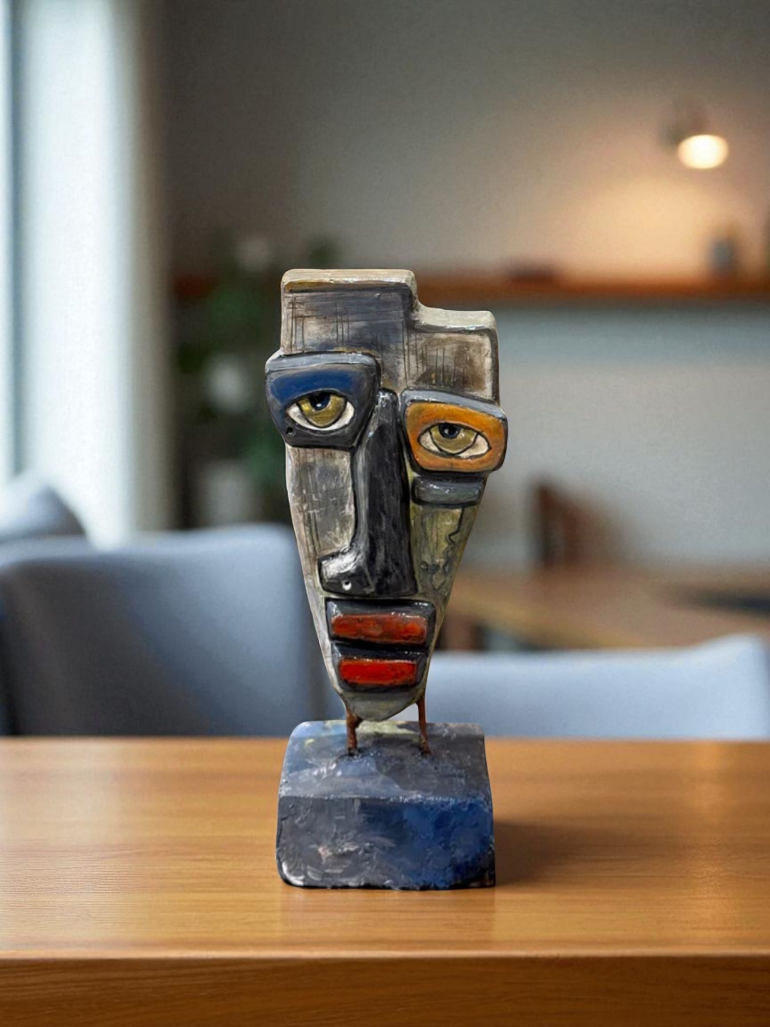 Burning men is a captivating hand-crafted sculpture that blends cubist abstraction with modern emotion. Its asymmetrical face, adorned with bold, mismatched eyes and vibrant lips, tells a story of duality and expression. Rich hues of blue, ochre, and crimson create a moody yet sophisticated palette that commands attention. Whether placed in a modern loft or an artful gallery wall, this piece brings an air of curated intellect and luxury.
