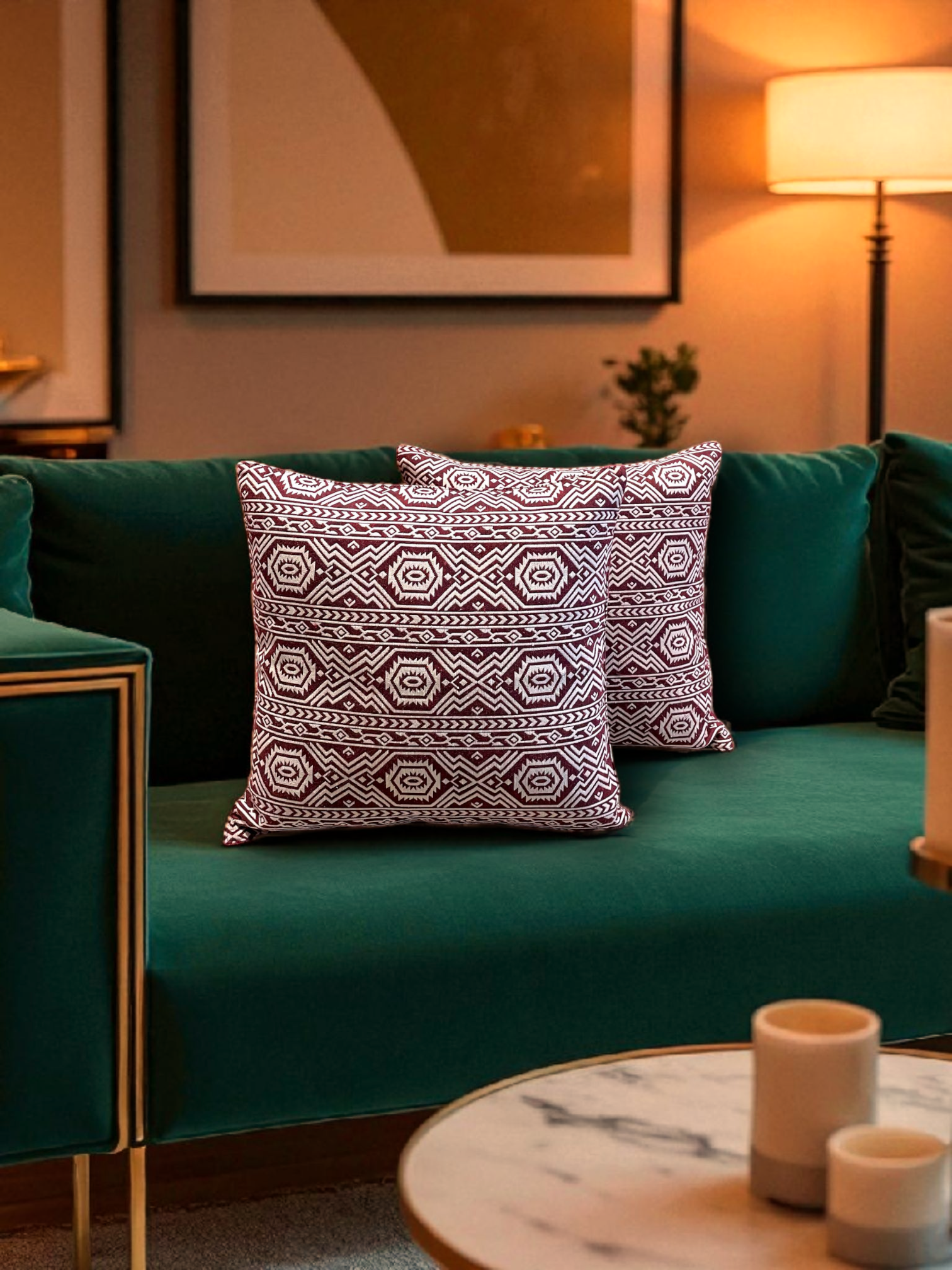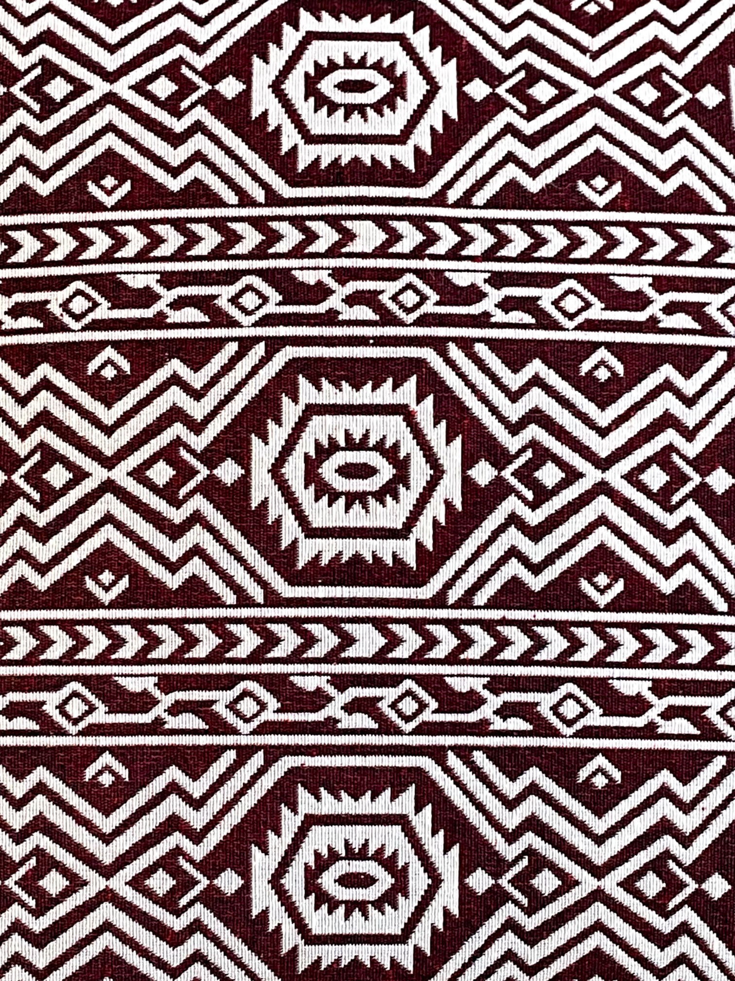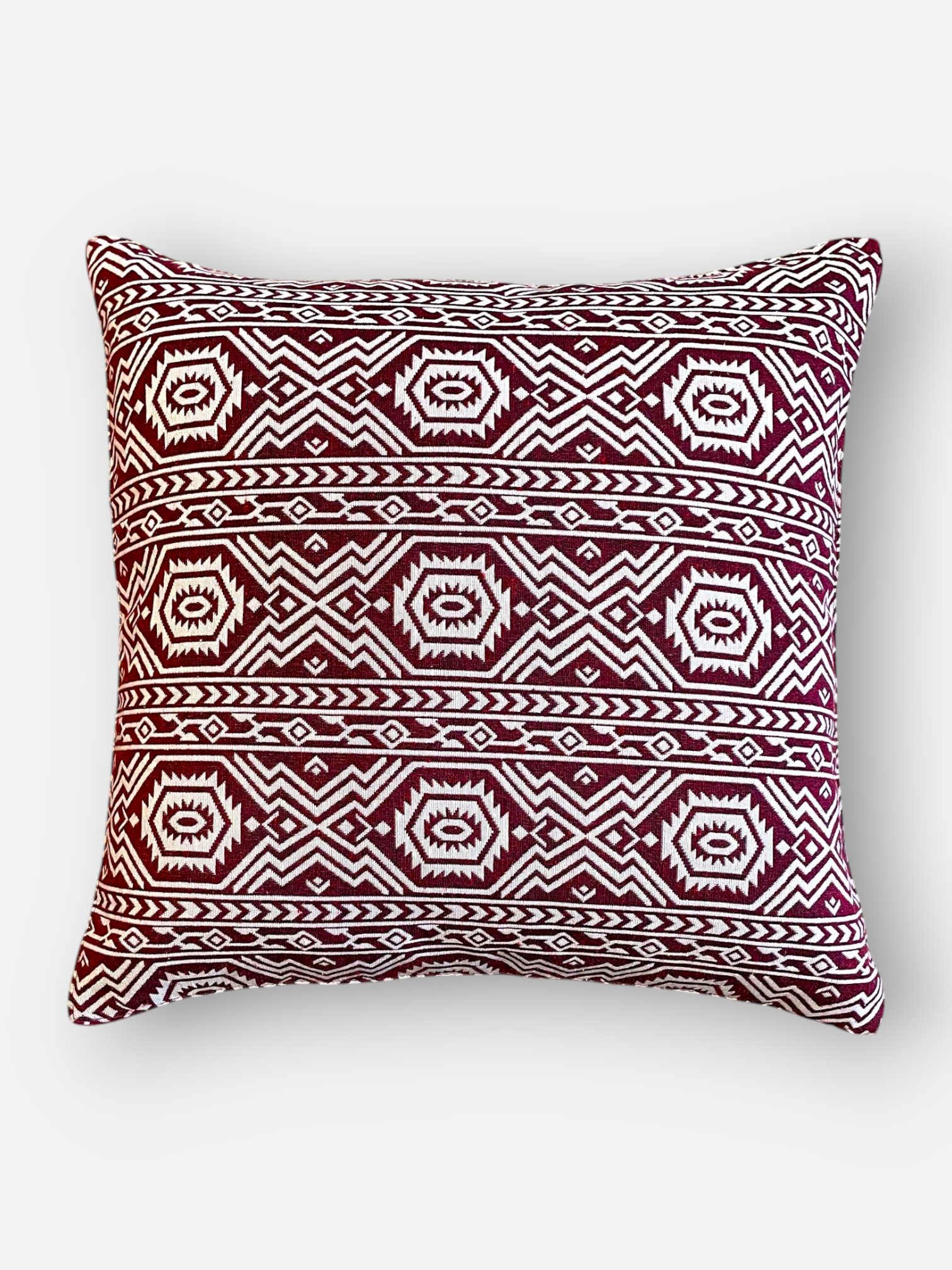 A statement cushion that draws inspiration from ancient tribal artistry and modern luxury. Its striking deep maroon burgundy hue is intricately woven with ivory-white geometric symbols, exuding rhythm, heritage, and balance. Crafted with precision and a nod to global textiles, this piece adds bold elegance to curated interiors. Ideal for spaces that embrace culture and contemporary sophistication.