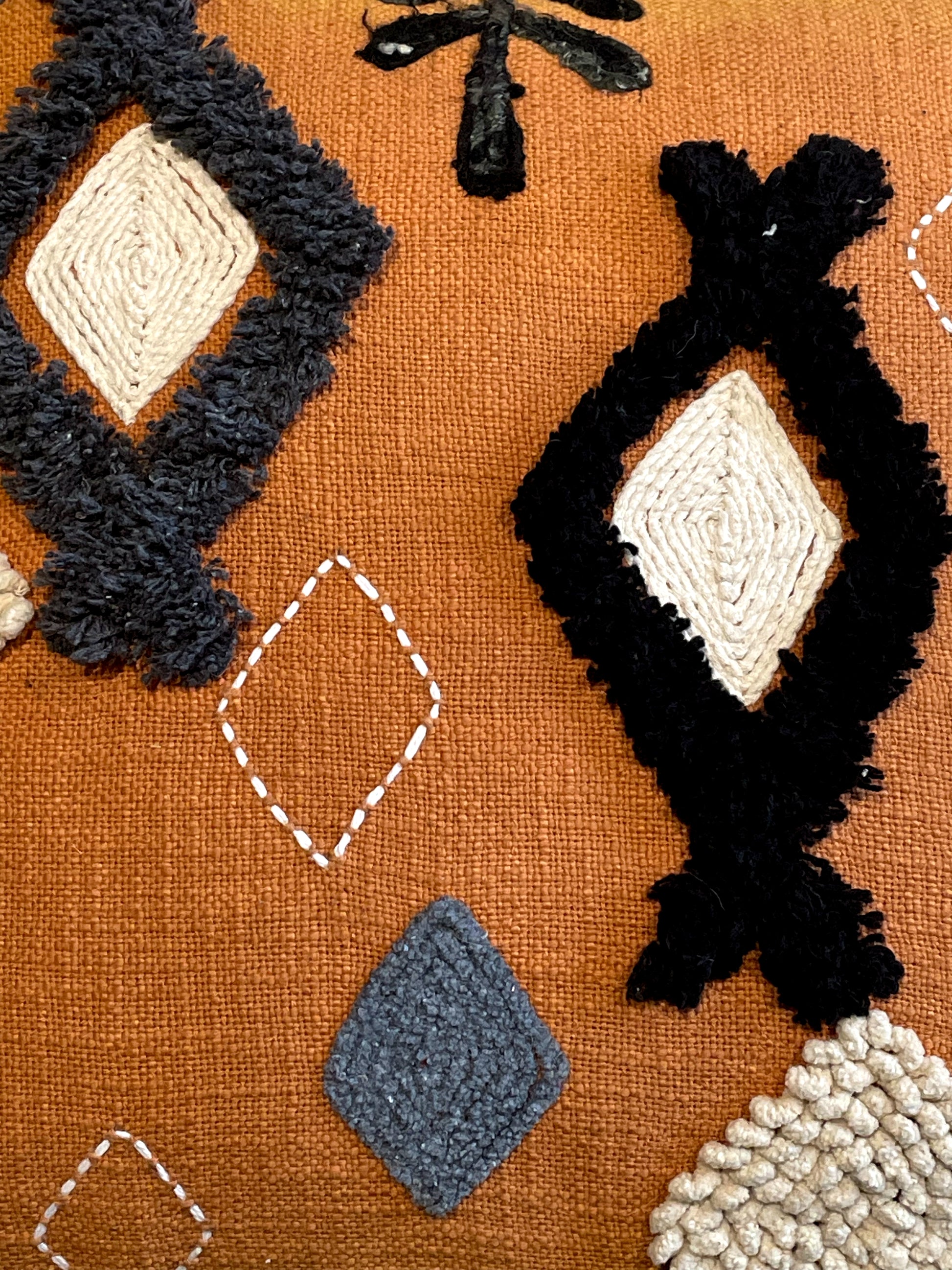 Bring home the soul of artisan heritage with Roux cushion, a cushion born from intricate loop embroidery and global storytelling. Set against a rich terracotta rust cotton slub fabric, every geometric motif whispers of tribal rhythms and desert elegance. The raised textures and handwoven detailing invite touch, making it not just a piece of décor - but a statement of sophistication. Perfect for the curated spaces where design meets soul.