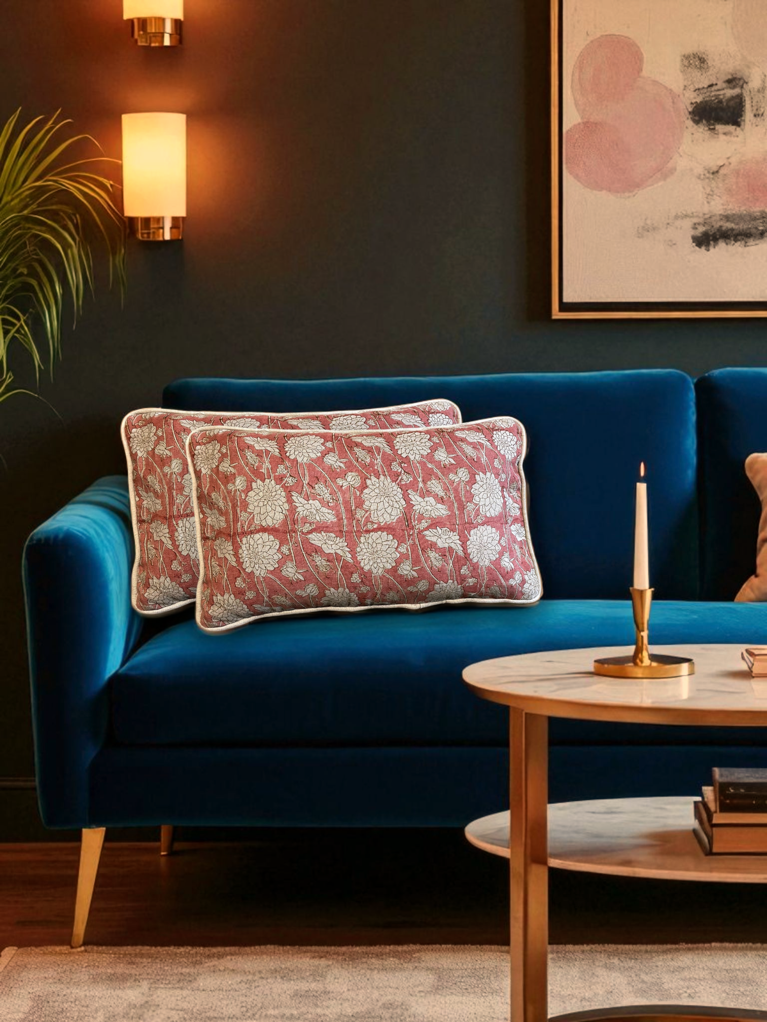 Elevate your space with the timeless charm of Rheva bloom lumber cushion Crafted on a dusty rose canvas, this lumber cushion features delicately hand-embroidered ivory florals that whisper of vintage elegance and artisanal finesse. The intricate botanical pattern evokes classic European gardens, blending romance with refined craftsmanship. Perfect for statement interiors, it brings warmth, heritage, and sophistication into any luxury setting