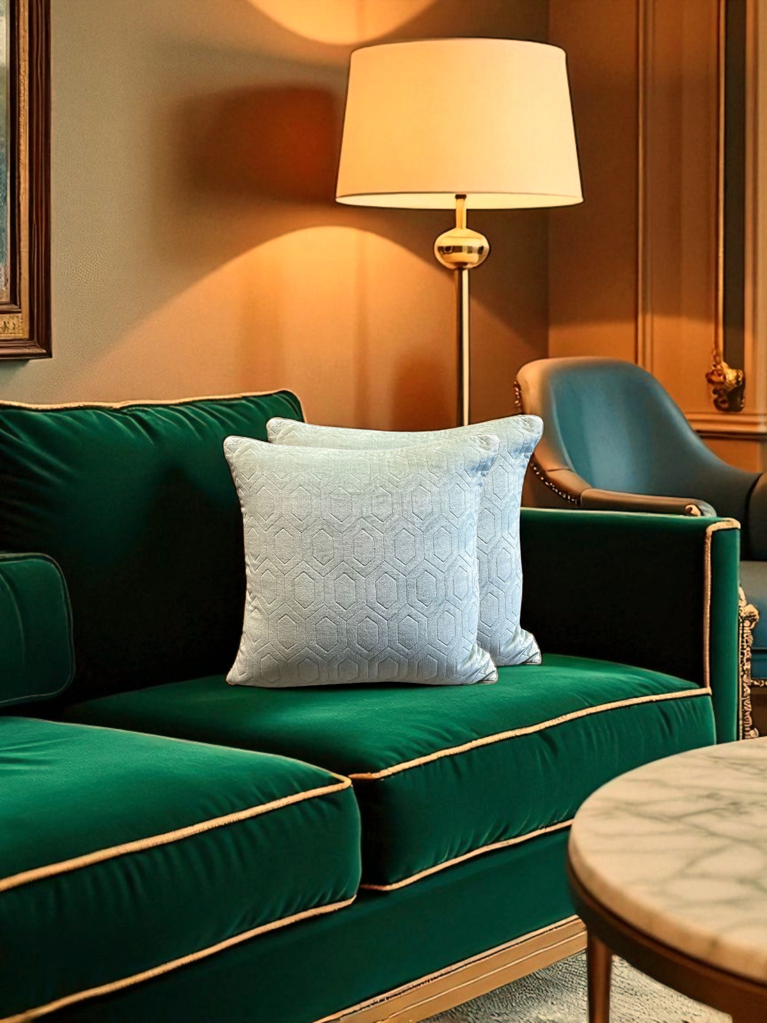 Indulge in the quiet elegance of the Duvone Cushion, where artistry meets opulence. Wrapped in a pale sage green velvet, its geometric embossing captures light in a gentle, sophisticated dance. This cushion speaks of understated luxury - perfect for curated spaces that blend classic textures with modern tranquility. Elevate your living environment with a piece that whispers refinement.