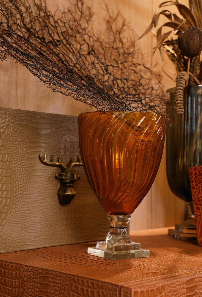 Bring all your attention to this contemporary straight cut orange glass hurricane to add style to your home . Crafted with great precision and elegance, this cut glass accentuates the beauty of your home.