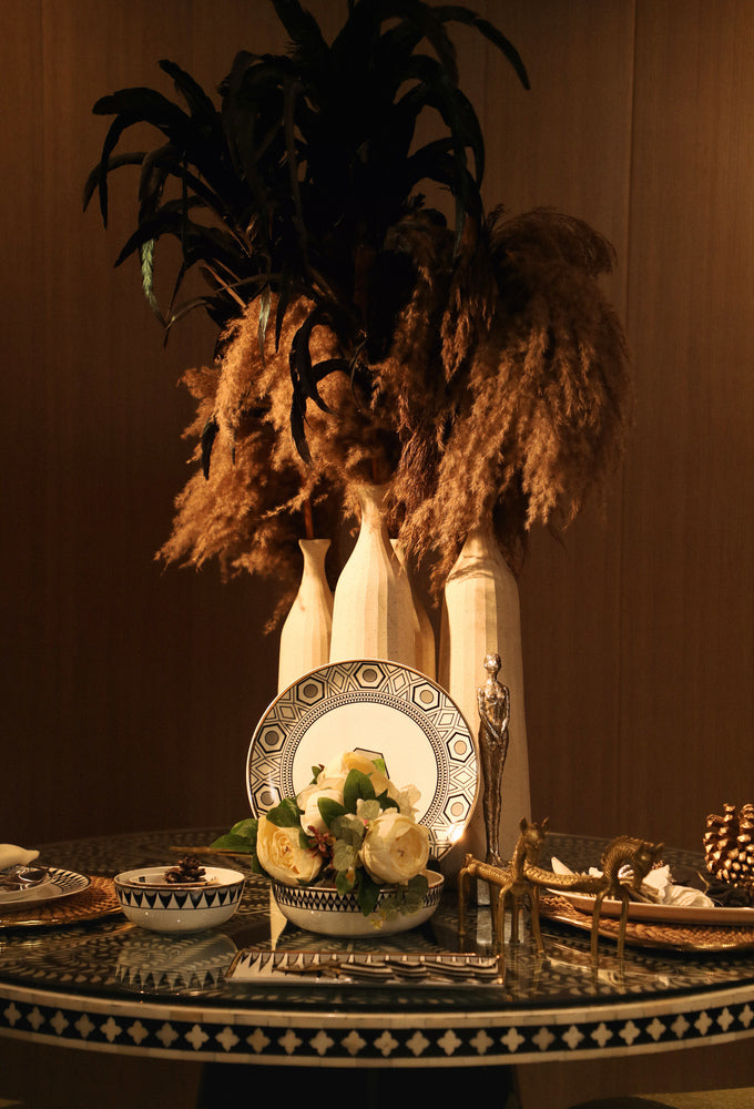 White Lightning Vase crafted with meticulous artistry from the metal and ceramic exudes a timeless allure. A masterpiece in design, this vase captivates with its sleek silhouette and rich white hue, seamlessly blending opulence and modernity.