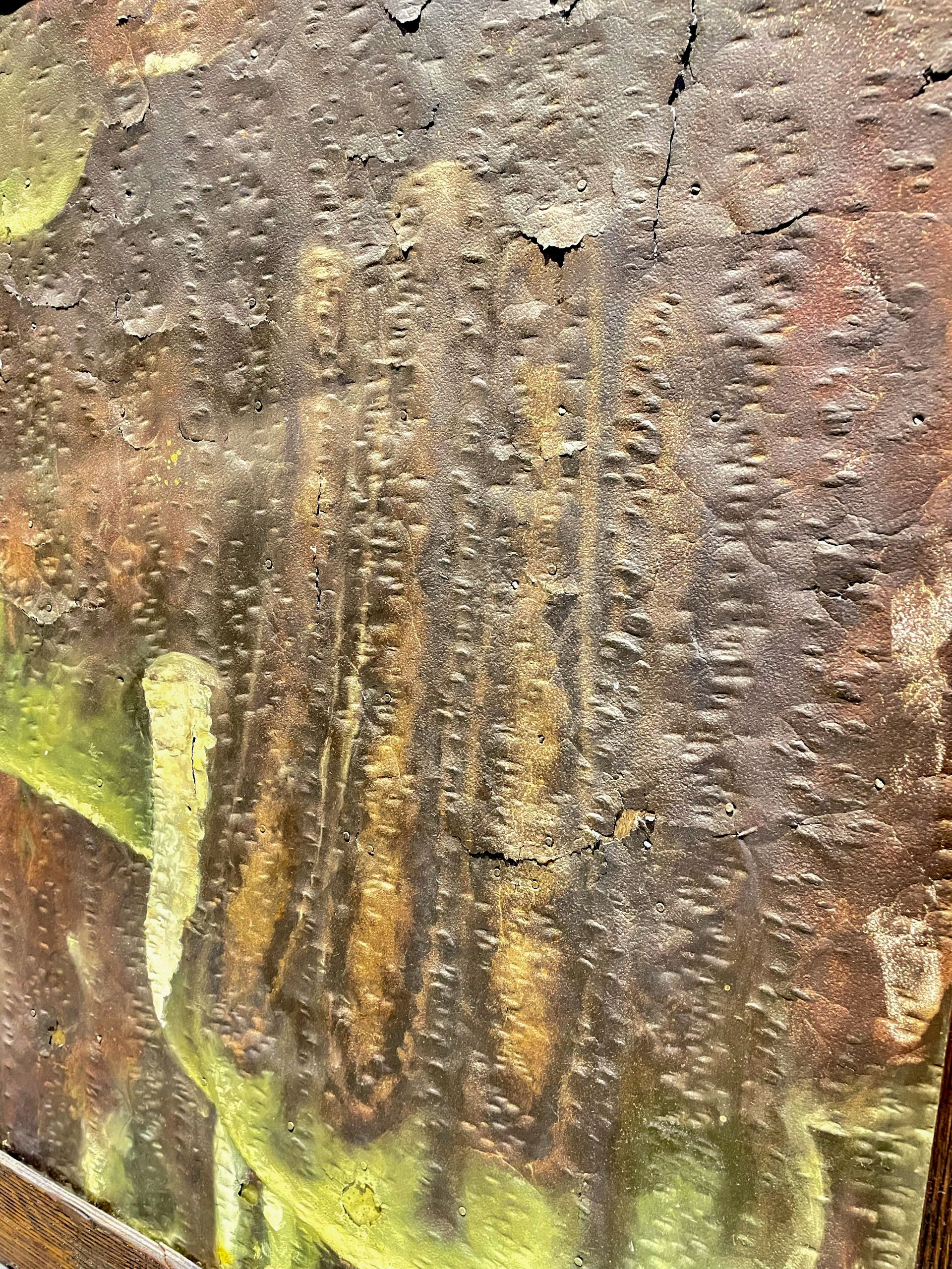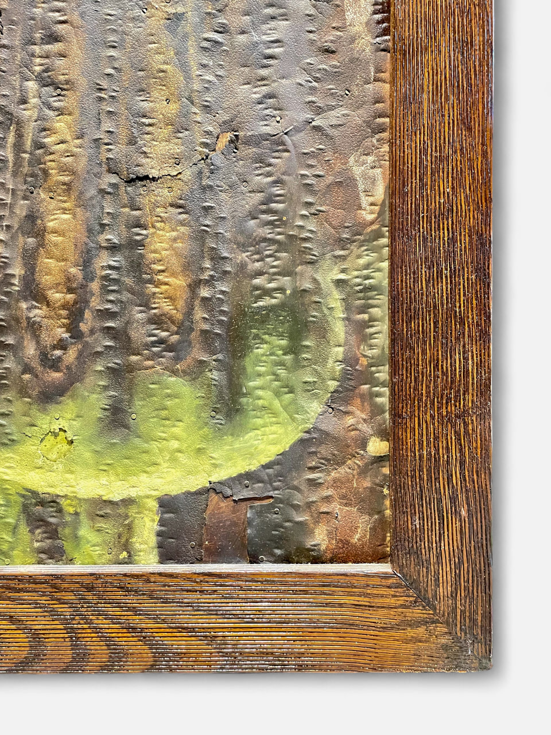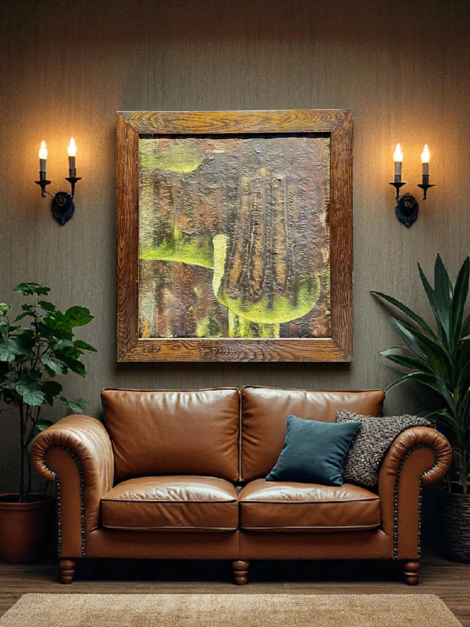 Bring the mystique of nature indoors with Amazonico art work, a captivating wall art piece that fuses deep forest hues with radiant chartreuse highlights. Its textured surface evokes bark-like patterns, adding dimension and intrigue to any space. Framed in rustic wood, the piece feels both ancient and alive. Ideal for collectors of abstract organic art with a raw, elemental energy.